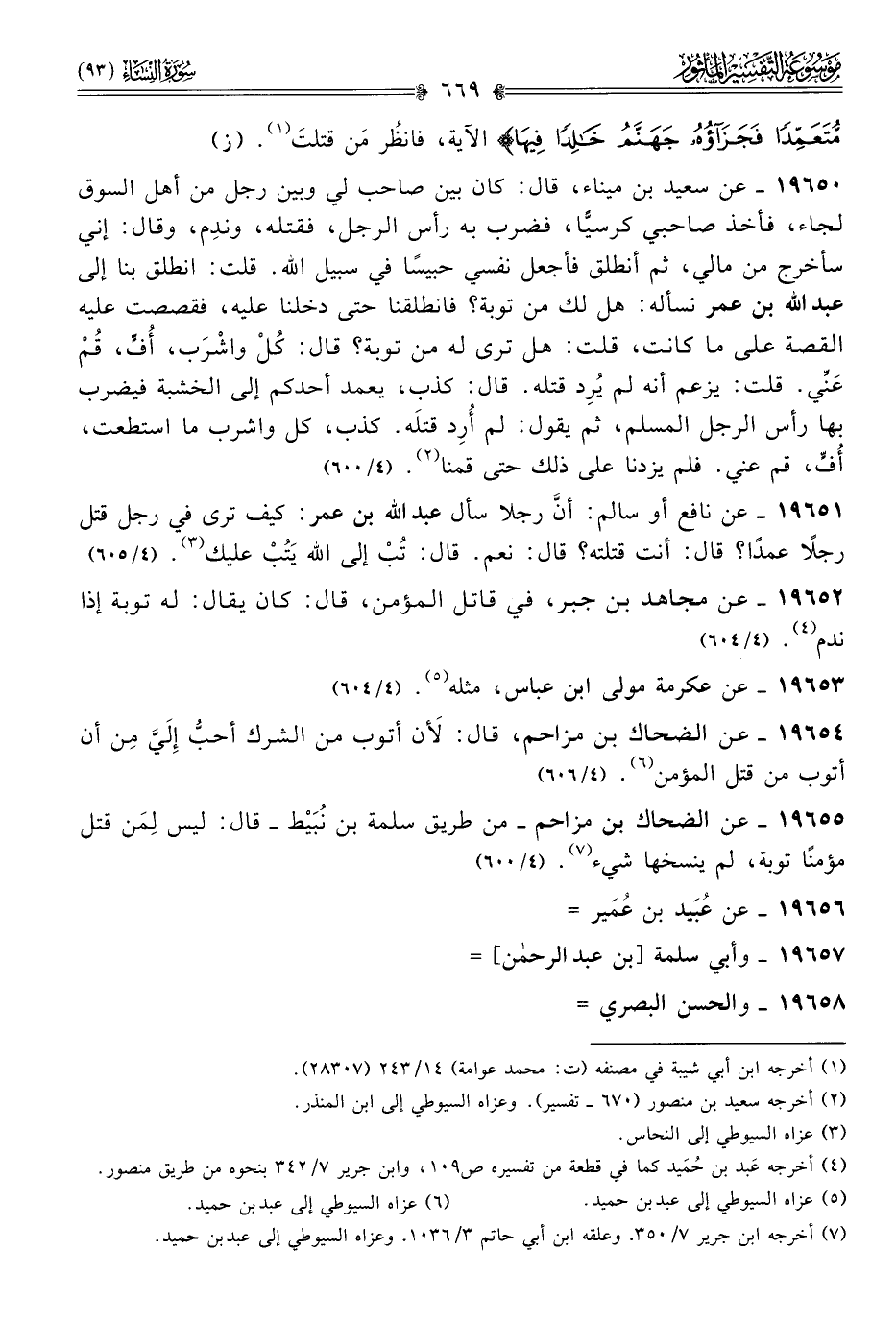 ١٩٦٥٥ - عن الضحاك بن مزاحم -من طريق سلمة بن نبيط- قال: ليس لِمَن قتل مؤمنًا توبة، لم ينسخها شيء (¬٧). (٤/ ٦٠٠)