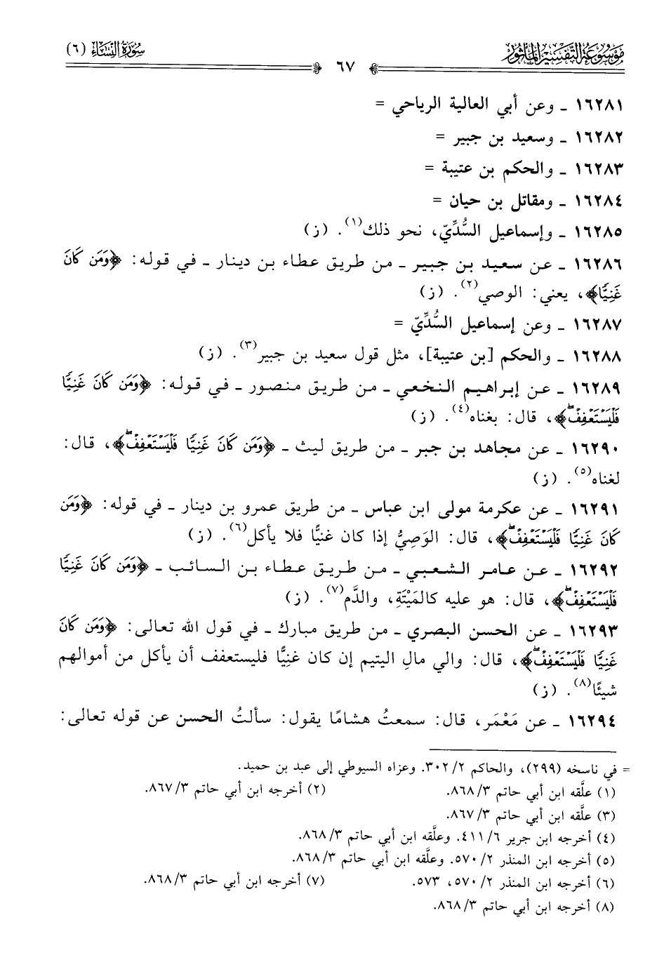 ١٦٢٨٦ - عن سعيد بن جبير -من طريق عطاء بن دينار- في قوله: {ومن كان غنيا}، يعني: الوصي (¬٢). (ز)