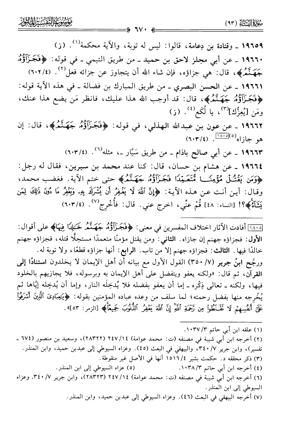 [١٨٠٥] أفادت الآثار اختلاف المفسرين في معنى: {فَجَزاؤُهُ جَهَنَّمُ خالِدًا فِيها} على أقوال: الأول: فجزاؤه جهنم إن جازاه. الثاني: ومن يقتل مؤمنًا متعمدًا مستحِلًّا قتله، فجزاؤه جهنم خالدًا فيها. الثالث: فجزاؤه جهنم إلا من تاب. الرابع: أنها جزاؤه قطعًا، ولا توبة له.