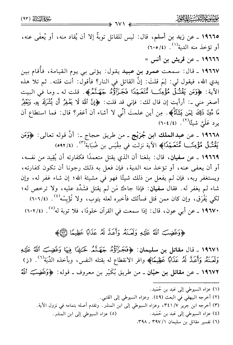 ١٩٦٦٨ - عن عبد الملك ابن جُرَيْج -من طريق حجاج- أنّ قوله تعالى: {ومن يقتل مؤمنا متعمدا} الآية نزلت في مِقْيَس بن ضُبابة (¬٣). (٤/ ٥٩٢)