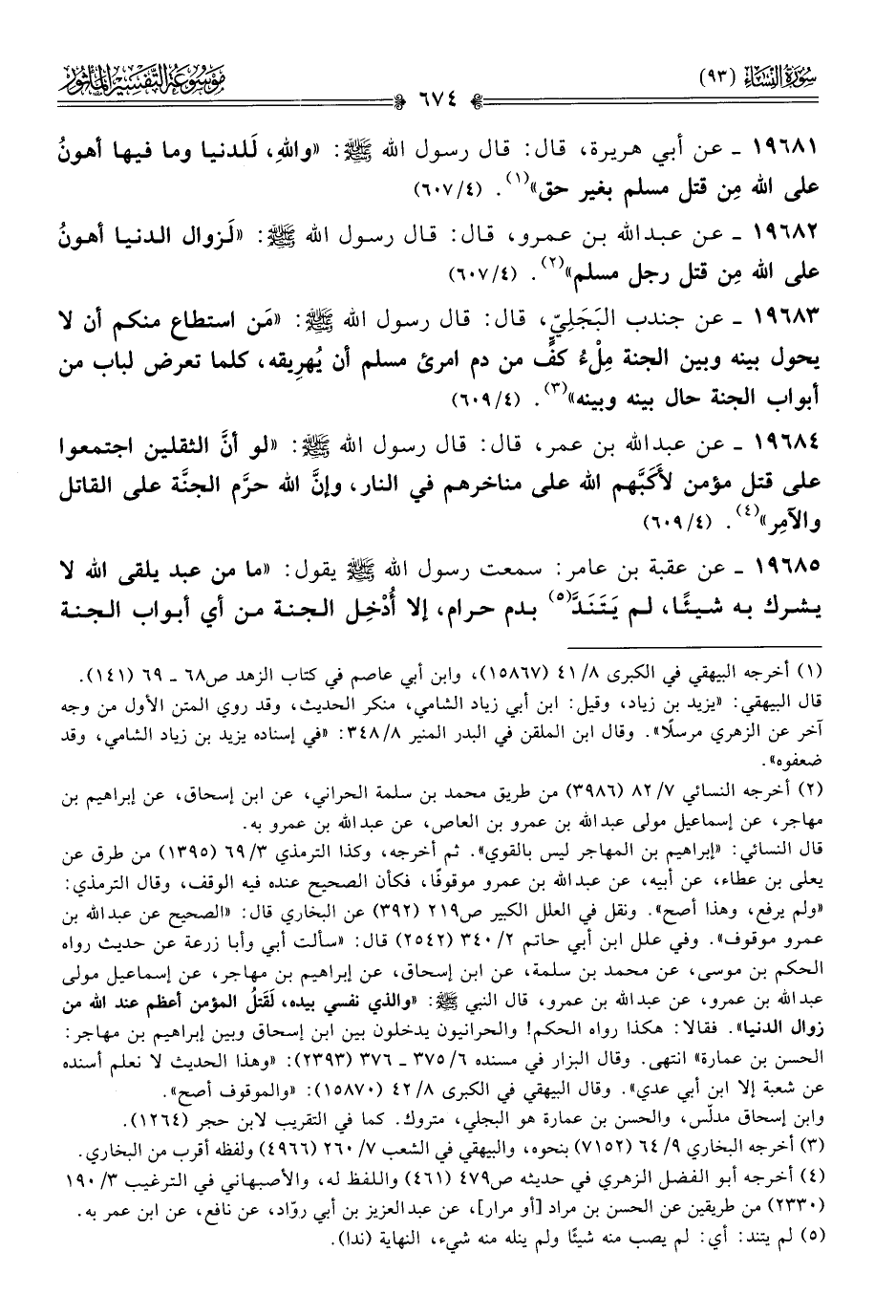 ١٩٦٨٢ - عن عبد الله بن عمرو، قال: قال رسول الله - صلى الله عليه وسلم -: «لَزوال الدنيا أهونُ على الله مِن قتل رجل مسلم» (¬٢). (٤/ ٦٠٧)