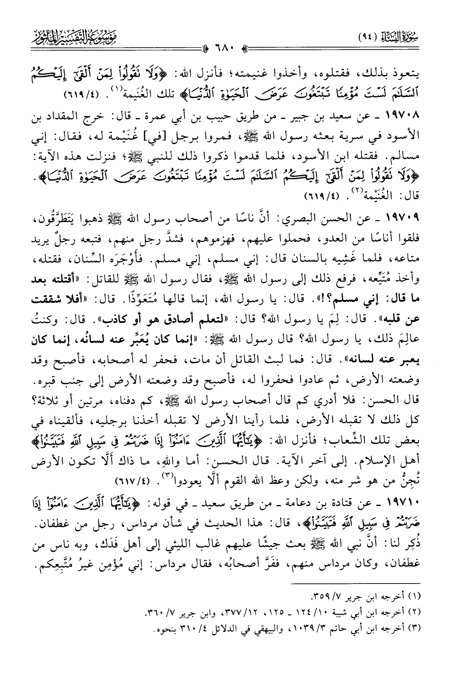 ١٩٧١٠ - عن قتادة بن دعامة -من طريق سعيد- في قوله: {يا أيها الذين ءامنوا إذا ضربتم في سبيل الله فتبينوا}، قال: هذا الحديث في شأن مرداس، رجل من غطفان. ذُكِر لنا: أنّ نبي الله - صلى الله عليه وسلم - بعث جيشًا عليهم غالب الليثي إلى أهل فَدَك، وبه ناس من غطفان، وكان مرداس منهم، ففَرَّ أصحابُه، فقال مرداس: إني مُؤْمِن غيرُ مُتَّبِعِكم.