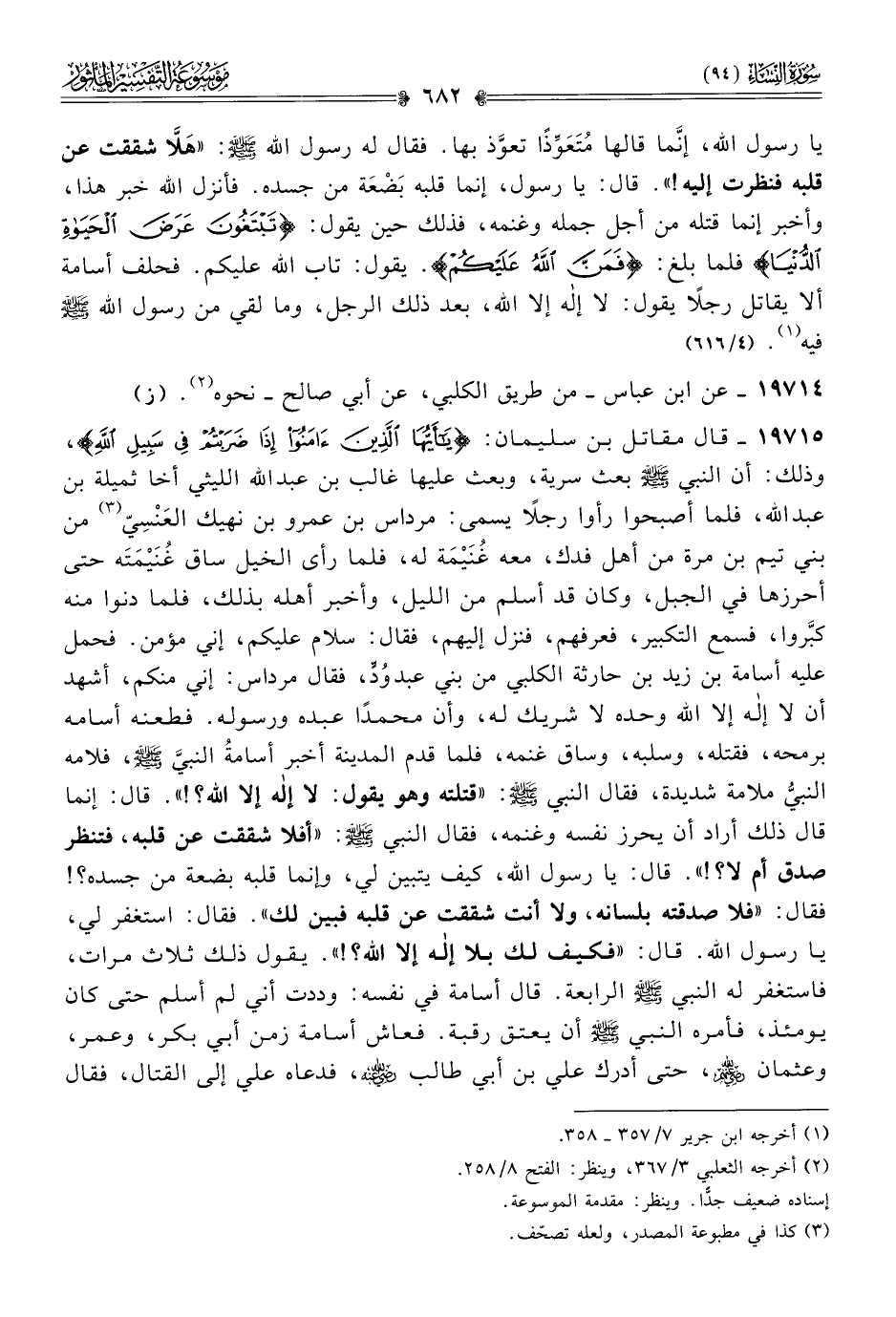 ١٩٧١٥ - قال مقاتل بن سليمان: {يا أيها الذين آمنوا إذا ضربتم في سبيل الله}، وذلك: أن النبي - صلى الله عليه وسلم - بعث سرية، وبعث عليها غالب بن عبد الله الليثي أخا ثميلة بن عبد الله، فلما أصبحوا رأوا رجلًا يسمى: مرداس بن عمرو بن نهيك العَنْسِيّ (¬٣) من بني تيم بن مرة من أهل فدك، معه غُنَيْمَة له، فلما رأى الخيل ساق غُنَيْمَتَه حتى أحرزها في الجبل، وكان قد أسلم من الليل، وأخبر أهله بذلك، فلما دنوا منه كبَّروا، فسمع التكبير، فعرفهم، فنزل إليهم، فقال: سلام عليكم، إني مؤمن. فحمل عليه أسامة بن زيد بن حارثة الكلبي من بني عبد وُدٍّ، فقال مرداس: إني منكم، أشهد أن لا إله إلا الله وحده لا شريك له، وأن محمدًا عبده ورسوله. فطعنه أسامه برمحه، فقتله، وسلبه، وساق غنمه، فلما قدم المدينة أخبر أسامةُ النبي - صلى الله عليه وسلم -، فلامه النبي ملامة شديدة، فقال النبي - صلى الله عليه وسلم -: «قتلته وهو يقول: لا إله إلا الله؟!». قال: إنما قال ذلك أراد أن يحرز نفسه وغنمه، فقال النبي - صلى الله عليه وسلم -: «أفلا شققت عن قلبه، فتنظر صدق أم لا؟!». قال: يا رسول الله، كيف يتبين لي، وإنما قلبه بضعة من جسده؟! فقال: «فلا صدقته بلسانه، ولا أنت شققت عن قلبه فبين لك». فقال: استغفر لي، يا رسول الله. قال: «فكيف لك بلا إله إلا الله؟!». يقول ذلك ثلاث مرات، فاستغفر له النبي - صلى الله عليه وسلم - الرابعة. قال أسامة في نفسه: وددت أني لم أسلم حتى كان يومئذ، فأمره النبي - صلى الله عليه وسلم - أن يعتق رقبة. فعاش أسامة زمن أبى بكر، وعمر، وعثمان - رضي الله عنهم -، حتى أدرك علي بن أبى طالب?، فدعاه علي إلى القتال، فقال