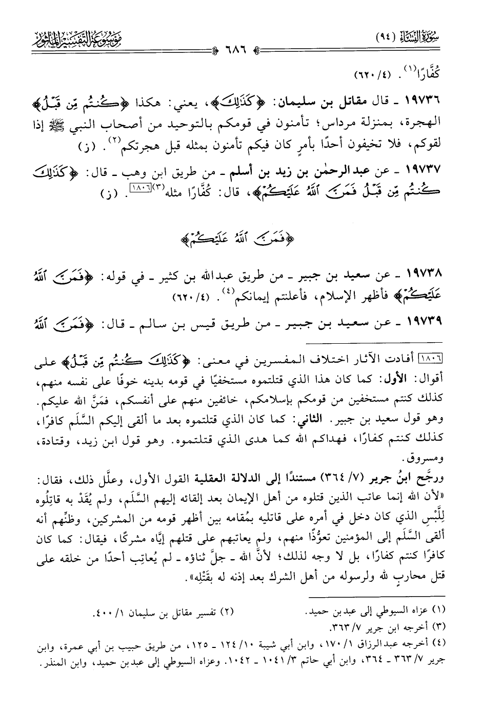 ١٩٧٣٨ - عن سعيد بن جبير -من طريق عبد الله بن كثير- في قوله: {فمن الله عليكم} فأظهر الإسلام، فأعلنتم إيمانكم (¬٤). (٤/ ٦٢٠)
