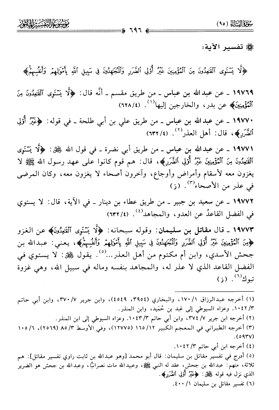 ١٩٧٧٣ - قال مقاتل بن سليمان: وقوله سبحانه: {لا يستوي القاعدون} عن الغزو {من المؤمنين غير أولي الضرر والمجاهدون في سبيل الله بأموالهم وأنفسهم}، يعني: عبد الله بن جحش الأسدي، وابن أم مكتوم من أهل العذر ... (¬٥).