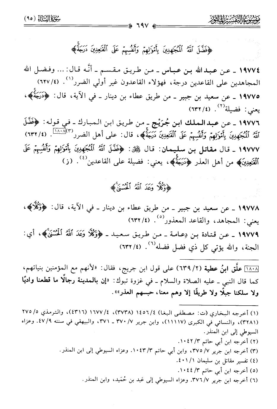 ١٩٧٧٦ - عن عبد الملك ابن جُرَيْج -من طريق ابن المبارك- في قوله: {فضل الله المجاهدين بأموالهم وأنفسهم على القاعدين درجة}، قال: على أهل الضرر (¬٣) [١٨٠٨]. (٤/ ٦٣٢)