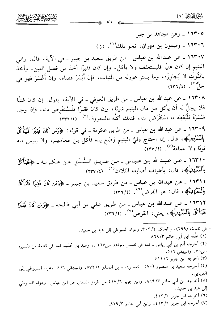 ١٦٣١٢ - عن عبد الله بن عباس -من طريق علي بن أبي طلحة- {ومن كان فقيرا فليأكل بالمعروف}، يعني: القرض (¬٧).