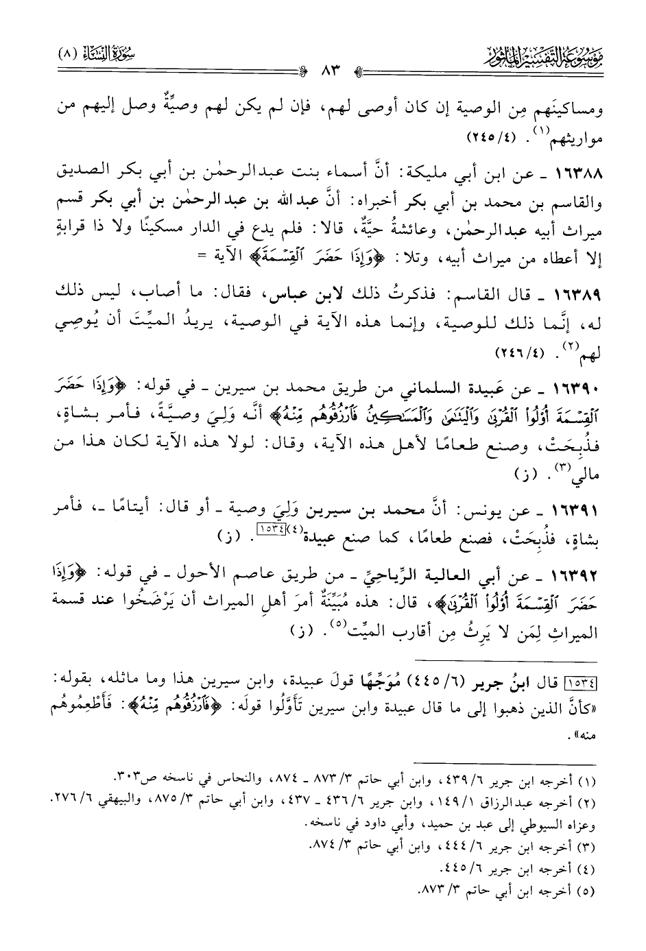 ١٦٣٨٩ - قال القاسم: فذكرتُ ذلك لابن عباس، فقال: ما أصاب، ليس ذلك له، إنّما ذلك للوصية، وإنما هذه الآية في الوصية، يريدُ الميِّتَ أن يُوصِي لهم (¬٢). (٤/ ٢٤٦)