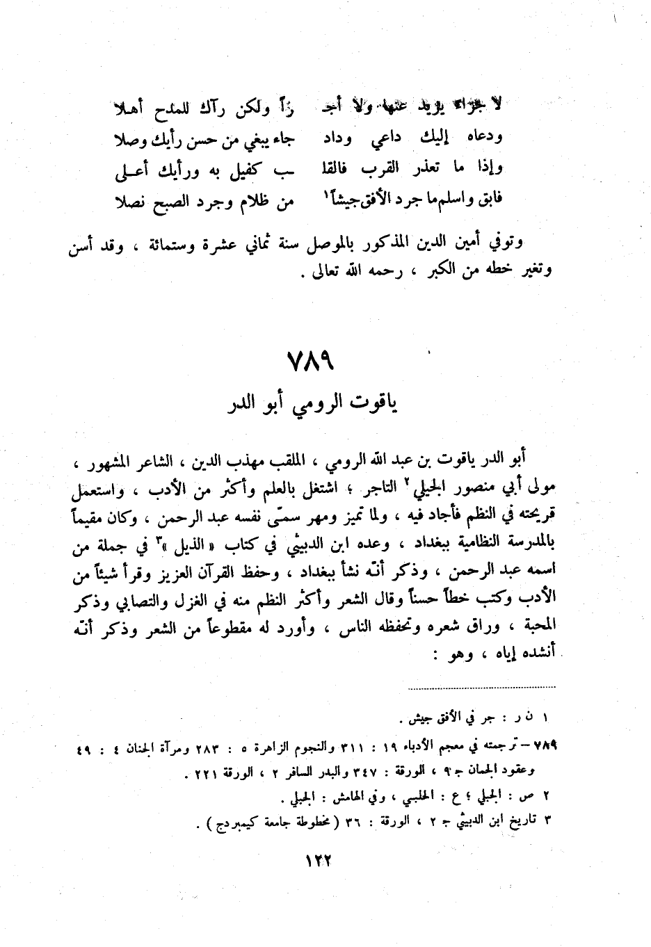 (2) ترجمته في معجم الأدباء 19: 311 والنجوم الزاهرة 5: 283 ومرآة الجنان 4: 49 وعقود الجمان ج 9، الورقة: 347 والبدر السافر 2، الورقة 221.