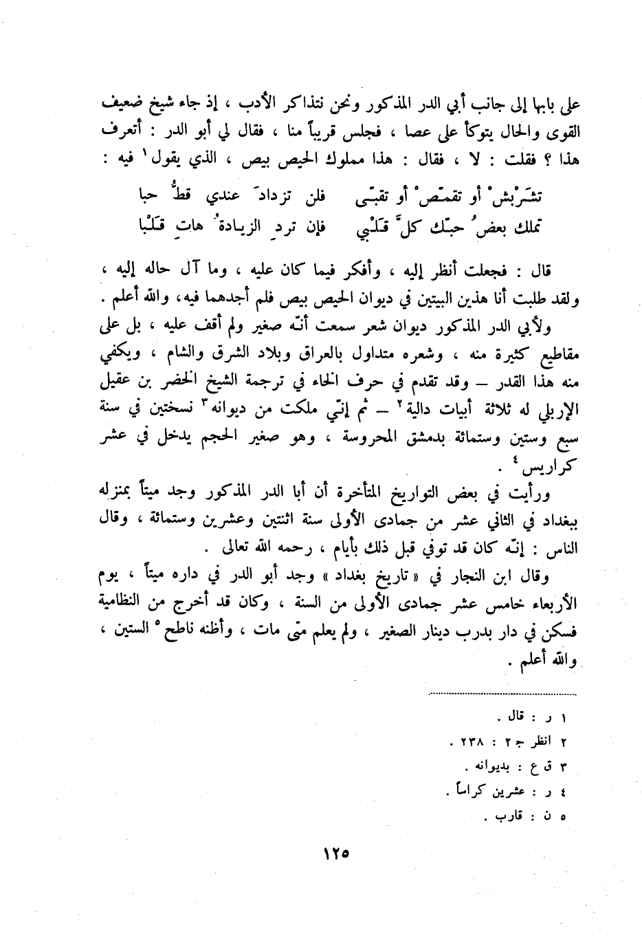 على بابها إلى جانب أبي الدر المذكور ونحن نتذاكر الأدب، إذ جاء شيخ ضعيف القوى والحال يتوكأ على عصا، فجلس قريباً منا، فقال لي أبو الدر: أتعرف هذا فقلت: لا، فقال: هذا مملوك الحيص بيص، الذي يقول (1) فيه: