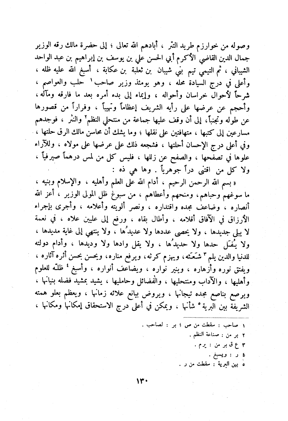 " بسم الله الرحمن الرحيم، أدام الله على العلم وأهليه، والإسلام وبني، ما سوغهم وحباهم، ومنحهم وأعطاهم، من سبوغ ظل المولى الوزير، أعز الله أنصاره، وضاعف مجده واقتداره، ونصر ألويته وأعلامه، وأجرى بإجراء الأرزاق في الآفاق أقلامه، وأطال بقاه، ورفع إلى عليين علاه، في نعمة لا يبلى جديدها، ولا يحصى عددها ولا عديدها، ولا ينتهي إلى غاية مديدها، ولا يفل حدها ولا حديدها، ولا يقل وادها ولا وديدها، وأدام دولته للدنيا والدين يلم (3) شعثه، ويهزم كرثه، ويرفع مناره، ويحسن بحسن أثره آثاره، ويفتق نوره وأزهاره، وينير نواره، ويضاعف أنواره، وأسبغ (4) ظله للعلوم وأهليها، والآداب ومنتحليها، والفضائل وحامليها، يشيد بمشيد فضله بنيانها، ويرصع بناصع مجده تيجانها، ويروض بيانع علأئه زمانها، ويعظم بعلو همته الشريفة بين البرية (5) شأنها، ويمكن في أعلى درج الاستحقاق إمكانها ومكانها،