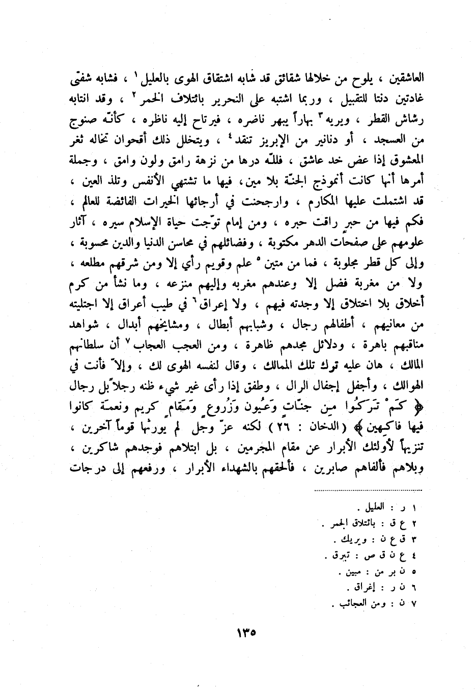 العاشقين، يلوح من خلالها شقائق قد شابه اشتقاق الهوى بالعليل (1) ، فشابه شفتى غادتين دنتا للتقبيل، وربما اشتبه على التحرير بائتلاف الخمر (2) ، وقد انتابه رشاش القطر، ويريه (3) بهاراً يبهر ناضره، فيرتاح إليه ناظره، كأنه صنوج من العسجد، أو دنانير من الإبريز تنقد (4) ، ويتخلل ذلك أقحوان تخاله ثغر المعشوق إذا عض خد عاشق، فلله درها من نزهة رامق ولون وامق، وجملة أمرها أنها كانت أنوذج الجنة بلا مين، فيها ما تشتهي النفس وتلذ العين قد اشتملت عليها المكارم، وارجحنت في أرجائها الخيرات الفائضة للعالم، فكم فيها من حبرٍ راقت حبره، ومن إمام توجت حياة الإسلام سيره، آثار علومهم على صفحات الدهر مكتوبة، وفضائلهم في محاسن الدنيا والدين محسوبة، وإلى كل قطرة مجلوبة، فما من متين (5) علم وقويم رأي إلا ومن شرقهم مطلعه، ولا من مغربة فضل إلا وعندهم مغربه وإليهم منزعه، وما نشأ من كرم أخلاق بلا اختلاق إلا وجدته فيهم، ولا أعراق (6) في طيب أعراق إلا اجتليته من معانيهم، أطفالهم رجال، وشبابهم أبطال، مشايخهم أبدال، شواهد مناقبهم باهرة، ودلائل مجدهم ظاهرة، ومن العجب العجاب (7) أن سلطانهم المالك، هان عليه ترك تلك الممالك، وقال لتفسه الهوى لك، وإلا فأنت في الهوالك، وأجفل إجفال الرال، وطفق إذا رأى غير شيء ظنه رجلاً بل رجال (كم تركوا من جناتٍ وعيون وزروعٍ ومقامٍ كريم ونعمة كانوا فيها فاكهين) لكنه عز وجل لم يورثها قوماً آخرين، تنزيهاً لأولئك الأبرار عن مقام المجرمين، بل ابتلاهم فوجدهم شاكرين، وبلاهم فألفاهم صابرين، فألحقهم بالشهداء الأبرار، ورفعهم إلى درجات
