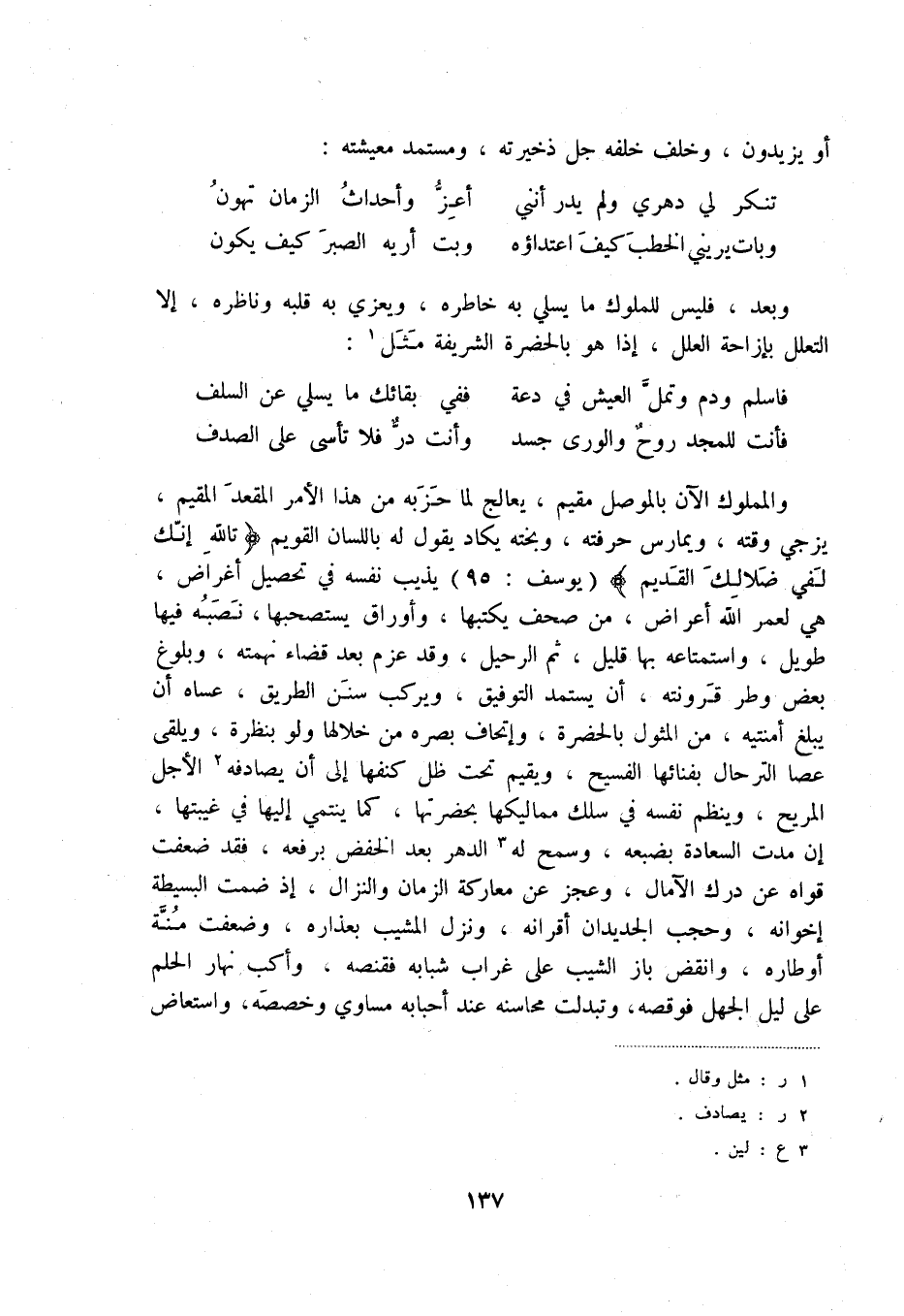فأنت للمجد روح والورى جسد ... وأنت در فلا تأسى على الصدف والمملوك الآن بالموصل مقيم، يعالج لما حزبه من هذا الأمر المقعد المقيم، يزجي وقته، ويمارس حرفته، وبخته يكاد يقول له باللسان القويم (تالله إنك لفي ضلالك القديم) (يوسف:95) يذيب نفسه في تحصيل أغراض، هي لعمر الله أعراض، من صحف يكتبها، وأوراق يستصحبها، نصبه فيها طويل، واستمتاعه بها قليل، ثم الرحيل، وقد عزم بعد قضاء نهمته، وبلوغ بعض وطر قرونته، أن يستمد التوفيق، ويركب سنن الطريق، عساه أن يبلغ أمنيته، من المثول بالحضرة، وإتحاف بصره من خلالها ولو بنظرة، ويلقى عصا الترحال بفنائها الفسيح، ويقيم تحت ظل كنفها إلى أن يصادفه (2) الأجل المريح، وينظم نفسه في سلك مماليكها بحضرتها، كما ينتمي إليها في غيبتها، إن مدت السعادة بضبعه، وسمح له (3) الدهر بعد الخفض برفعه، فقد ضعفت قواه عن درك الآمال، وعجز عن معاركة الزمان والنزال، إذ ضمت البسيطة إخوانه، وحجب الجديدان أقرانه، ونزل المشيب بعذاره، وضعفت منة أوطاره، وانقض باز على غراب شبابه فقنصه، وأكب نهار الحلم على ليل الجهل فوقصه، وتبدلت محاسنه عند أحبابه مساوي وخصصه، واستعاض