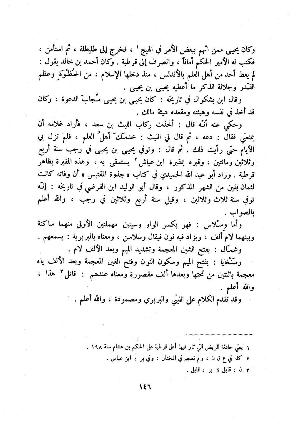 وحكي عنه أنه قال: أخذت ركاب الليث بن سعد، فأراد غلامه أن يمنعني فقال: دعه، ثم قال لي الليث: خدمك أهل العلم، فلم تزل بي الأيام حتى رأيت ذلك. ثم قال: وتوفي يحيى بن يحيى في رجب سنة أربع وثلاثين ومائتين، وقبره بمقبرة ابن عياش (2) يستسقى به، وهذه المقبرة بظاهر قرطبة، وزاد أبو عبد الله الحميدي في كتاب " جذوة المقتبس " أن وفاته كانت لثمان بقين من الشهر المذكور، وقال أبو الوليد ابن الفرضي في تاريخه: إنه سنة ثلاث وثلاثين، وقيل سنة أربع وثلاثين في رجب، والله أعلم بالصواب.