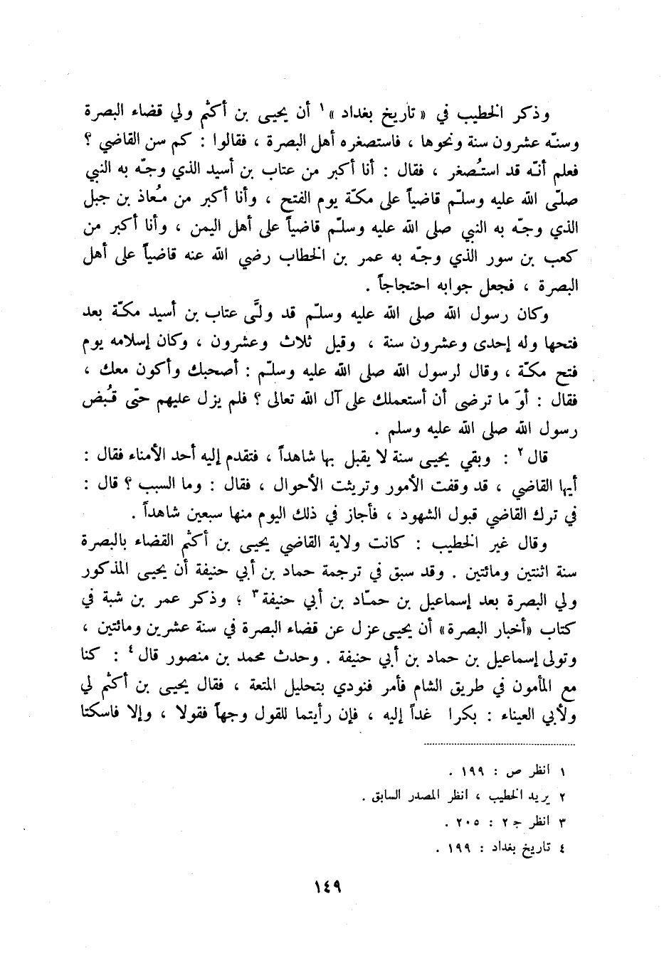 وذكر الخطيب في " تاريخ بغداد " (1) أن يحيى بن أكثم ولي قضاء البصرة وسنه عشرون سنة ونحوها، فاستصغره أهل البصرة، فقالوا: كم سن القاضي فعلم أنه استصغر، فقال: أنا أكبر من عتاب بن أسيد الذي وجه به النبي صلى الله عليه وسلم قاضياً على مكة يوم الفتح، وأنا أكبر من معاذ بن جبل الذي وجه به النبي صلى الله عليه وسلم قاضياً على أهل اليمن، وأنا أكبر من كعب بن سور الذي وجه به عمر بن الخطاب رضي الله عنه قاضياً على أهل البصرة، فجعل جوابه احتجاجاً.