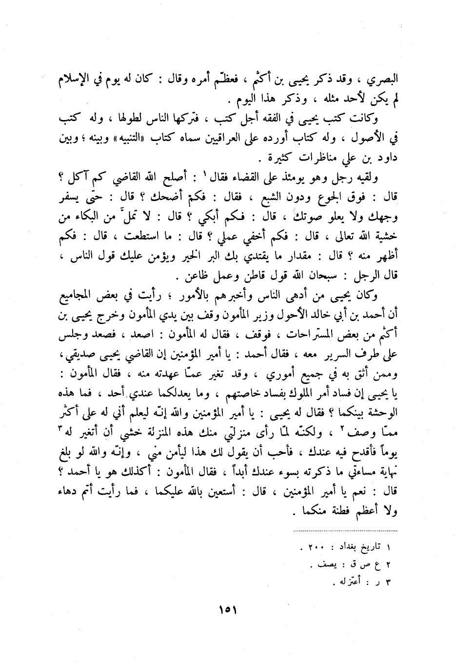 وكان يحيى من أدهى الناس وأخبرهم بالأمور، رأيت في بعض المجاميع أن أحمد بن أبي خالد الأحول وزير المأمون وقف بين يدي المأمون وخرج يحيى بن أكثم من بعض المستراحات، فوقف، فقال له المأمون اصعد، فصعد وجلس على طرف السرير معه، فقال أحمد: يا أمير المؤمنين إن القاضي يحيى صديقي، وممن أثق به في جميع أموري، وقد تغير عما عهدته منه، فقال المأمون: يا يحيى إن فساد أمر الملوك بفساد خاصتهم، وما يعدلكما عندي أحد، فما هذه الوحشة بينكما فقال له يحيى: يا أمير المؤمنين والله إنه ليعلم أني له على أكثر مما وصف (2) ، ولكنه لما رأى منزلتي منك هذه المنزلة خشي أن أتغير له (3) يوماً فأقدح فيه عندك، فأحب أن يقول لك هذا ليأمن مني، وإنه والله لو بلغ نهاية ماءتي ما ذكرته بسوء عندك أبداً، فقال المأمون: أكذلك هو يا أحمد قال: نعم يا أمير المؤمنين، قال: أستعين بالله عليكما، فما رأيت أتم دهاء ولا أعظم فطنة منكما.