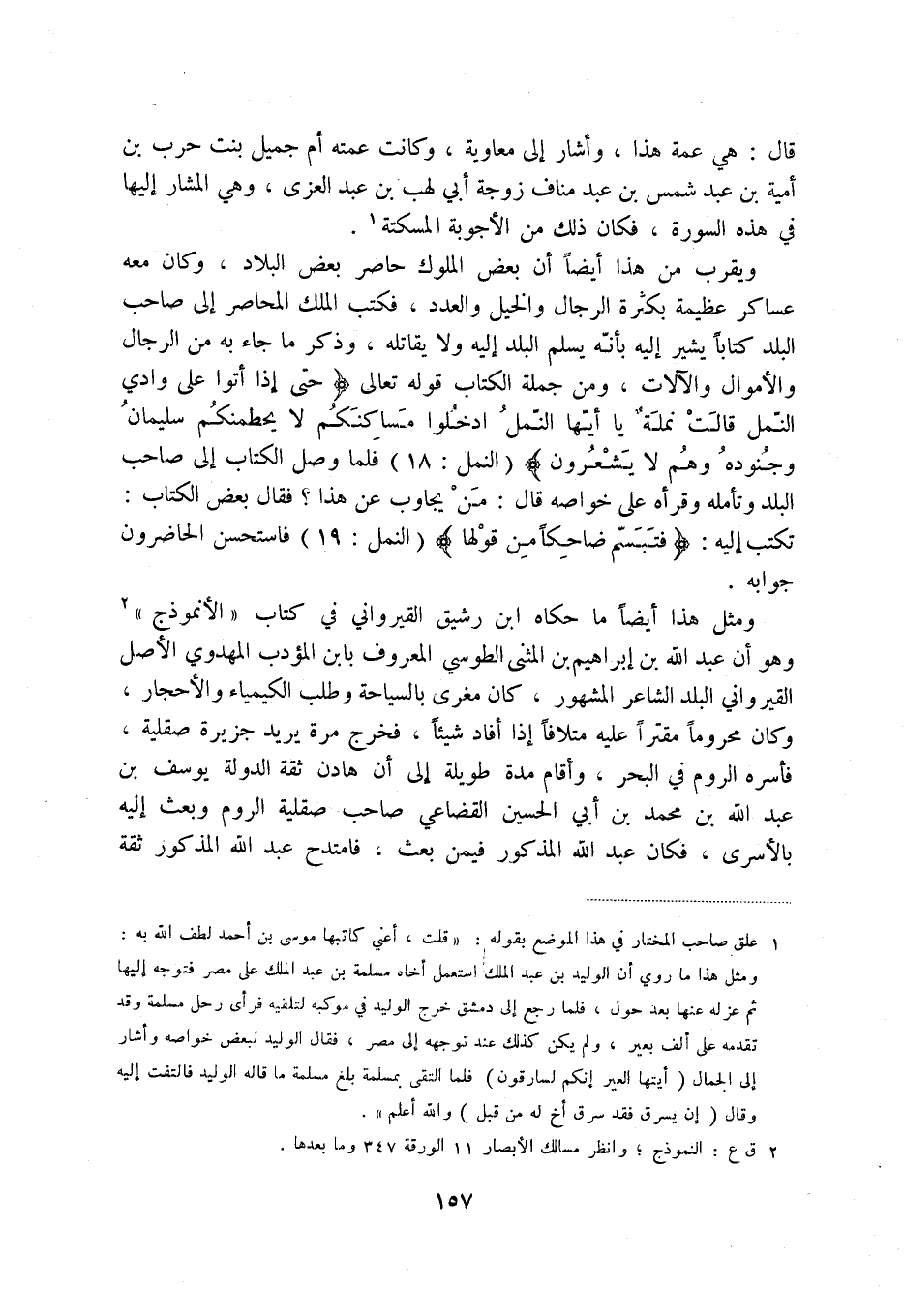 (1) علق صاحب المختار في هذا الموضع بقوله: " قلت، أعني كاتبها موسى بن أحمد لطف الله به: ومثل هذا ما روي أن الوليد بن عبد الملك استعمل أخاه مسلمة بن عبد الملك على مصر فتوجه إليهما ثم عزله عنها بعد حول، فلما رجع إلى دمشق خرج الوليد في موكبه لتلقيه فرأى رحل مسلمة وقد تقدمه على ألف بعير، ولم يكن كذلك عند توجهه إلى مصر، فقال الوليد لبعض خواصه وأشار إلى الجمال (أيتها العير إنكم لسارقون) فلما التقى بمسلمة بلغ مسلمة ما قاله الوليد فالتفت إليه وقال (إن يسرق فقد سرق أخ له من قبل) والله أعلم ".