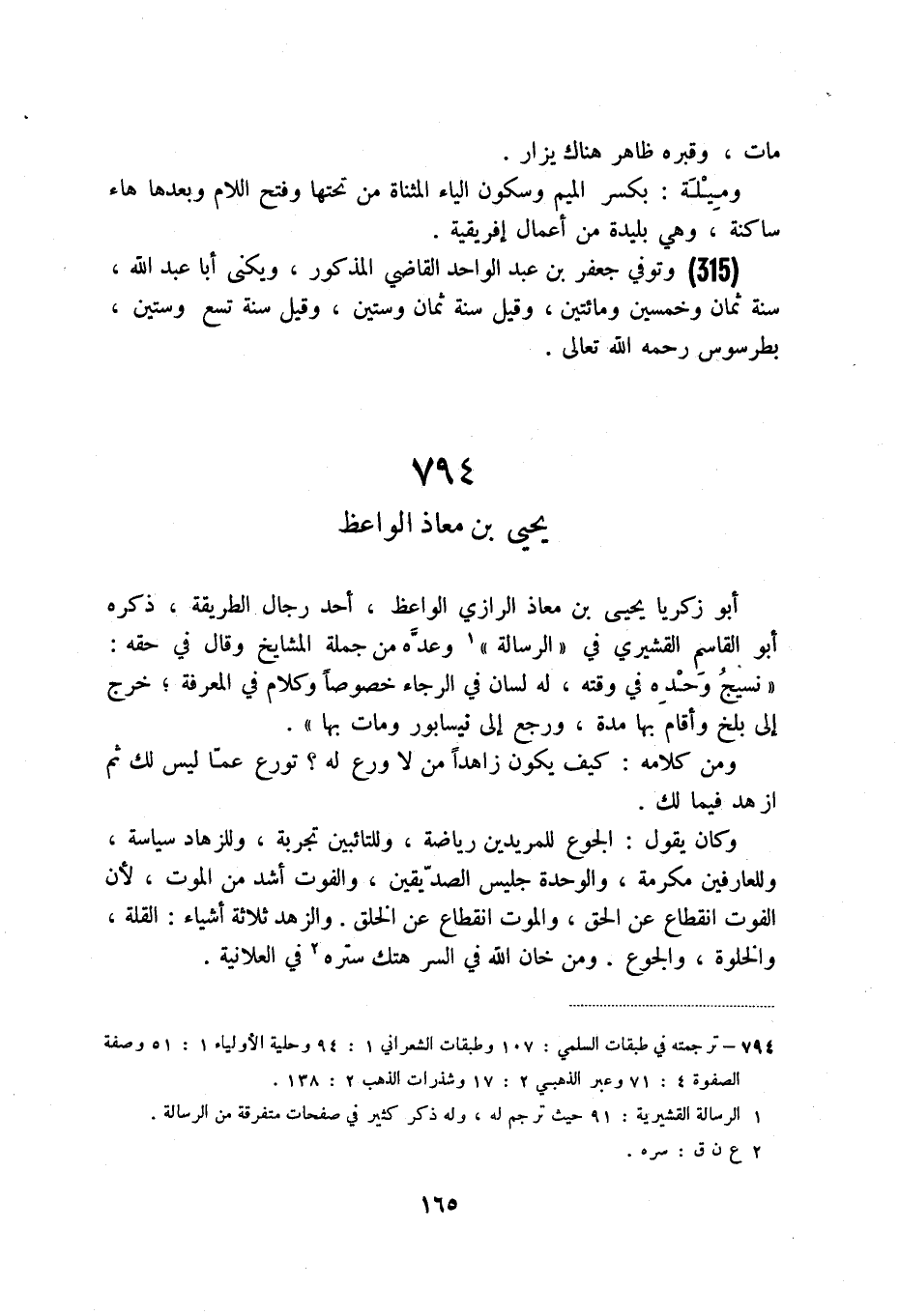 أبو زكريا يحيى بن معاذ الواعظ، أحد رجال الطريقة، ذكره أبو القاسم القشيري في " الرسالة " (2) وعده من جملة المشايخ وقال في حقه: " نسيج وحده في وقته، له لسان في الرجاء خصوصاً وكلام في المعرفة، خرج إلى بلخ وأقام بها مدة، ورجع إلى نيسابور ومات بها ".