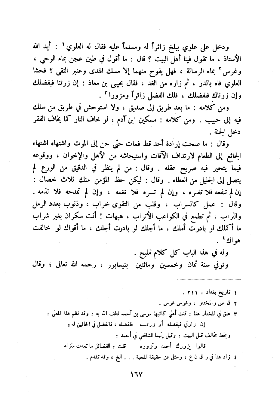 ودخل على علوي ببلخ زائراً له ومسلماً عليه فقال له العلوي (1) : أيد الله الأستاذ، ما تقول فينا أهل البيت قال: ما أقول في طين عجن بماء الوحي، وغرس (2) بماء الرسالة، فهل يفوح منهما إلا مسك الهدى وعنبر التقى فحشى العلوي فاه بالدر، ثم زاره من الغد، فقال يحيى بن معاذ: إن زرتنا فبفضلك وإن زرناك فلفضلك، فلك الفضل زائراً ومزوراً (3) .