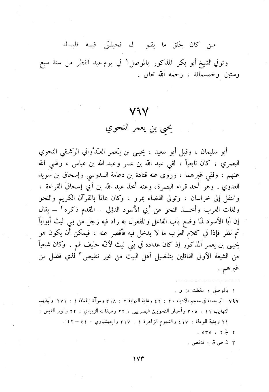 (2) ترجمته في معجم الأدباء 20: 42 وغاية النهاية 2: 318 ومرآة الجنان 1: 271 وتهذيب التهذيب 11: 305 وأخبار النحويين البصريين: 22 وطبقات الزبيدي: 22 ونور القبس: 21 وبغية الوعاة: 17؛ والنجوم الزاهرة 1: 217 والجهشياري: 41 - 42.