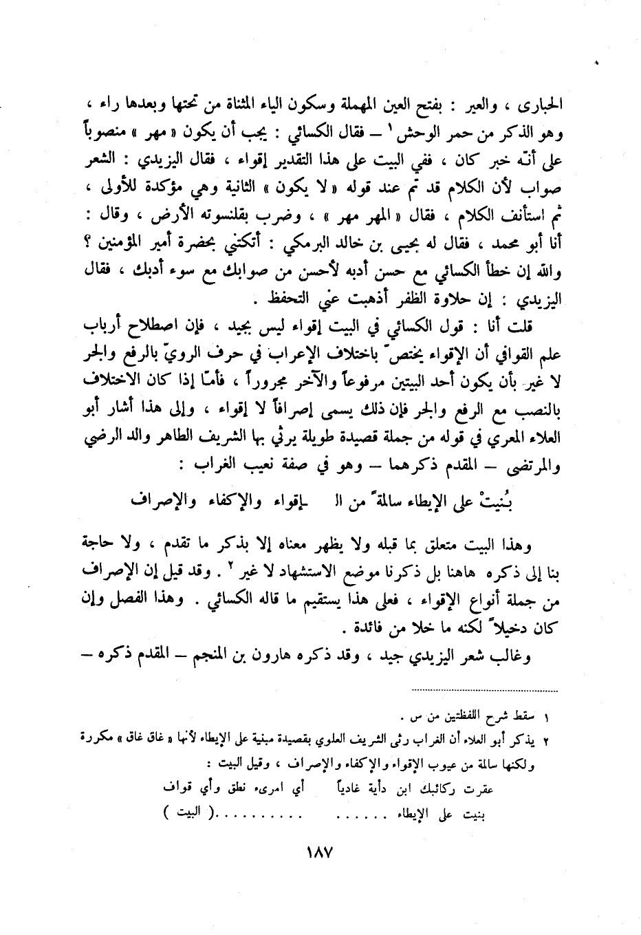 قلت أنا: قول الكسائي في البيت إقواء ليس بجيد، فإن إصلاح أرباب علم القوافي أن الأقواء يختص باختلاف الإعراب في حرف الروي بالرفع والجر لا غير بأن يكون أحد البيتين مرفوعاً والآخر مجروراً، فأما إذا كان الاختلاف بالنصب مع الرفع والجر فإن ذلك يسمى إصرافاً لا أقواء، وإلى هذا أشار أبو العلاء المعري في قوله من جملة قصيد طويلة يرثي بها الشريف الطاهر والد الرضي والمرتضى - المقدم ذكرهما - وهو من صفة بعيب الغراب: