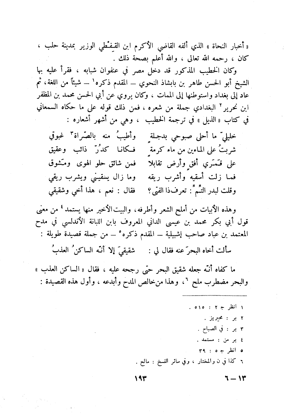 سألت أخاه البحر عنه فقال لي: ... شقيقي إلا أنه الساكن العذب ما كفاه أنه جعله شقيق البحر حتى رجحه عليه، فقال " الساكن العذب " والبحر مضطرب ملح (6) ، وهذا من خالص المدح وأبدعه، وأول هذه القصيدة: