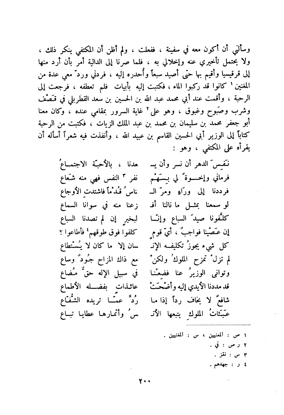 وسألني أن أكون معه في سفينة، ففعلت، ولم أظن أن المكتفي ينكر ذلك، ولا يحتمل تأخيري عنه وإخلالي به، فلما صرنا إلى الدالية أمر بأن أرد منها إلى قرقيسيا وأقيم بها حتى أصيد سبعاً وأحدره إليه، فردني ورد معي عدة من المغنين (1) كانوا قد ركبوا الماء، فكتب إليه بأبيات فلم تعطفه، فرجعت إلى الرحبة، وأقمت عند أبي محمد عبد الله بن الحسين بن سعد القطربلي في قصف وشرب وصبوح وغبوق، وهو على (2) غاية السرور بمقامي عنده، وكان معنا أبو جعفر محمد بن سليمان بن محمد بن عبد الملك الزيات، فكتبت من الرحبة كتاباً إلى الوزير أبي الحسين القاسم بن عبيد الله، وأنفذت فيه شعراً أسأله أن يقرأه على المكتفي، وهو: