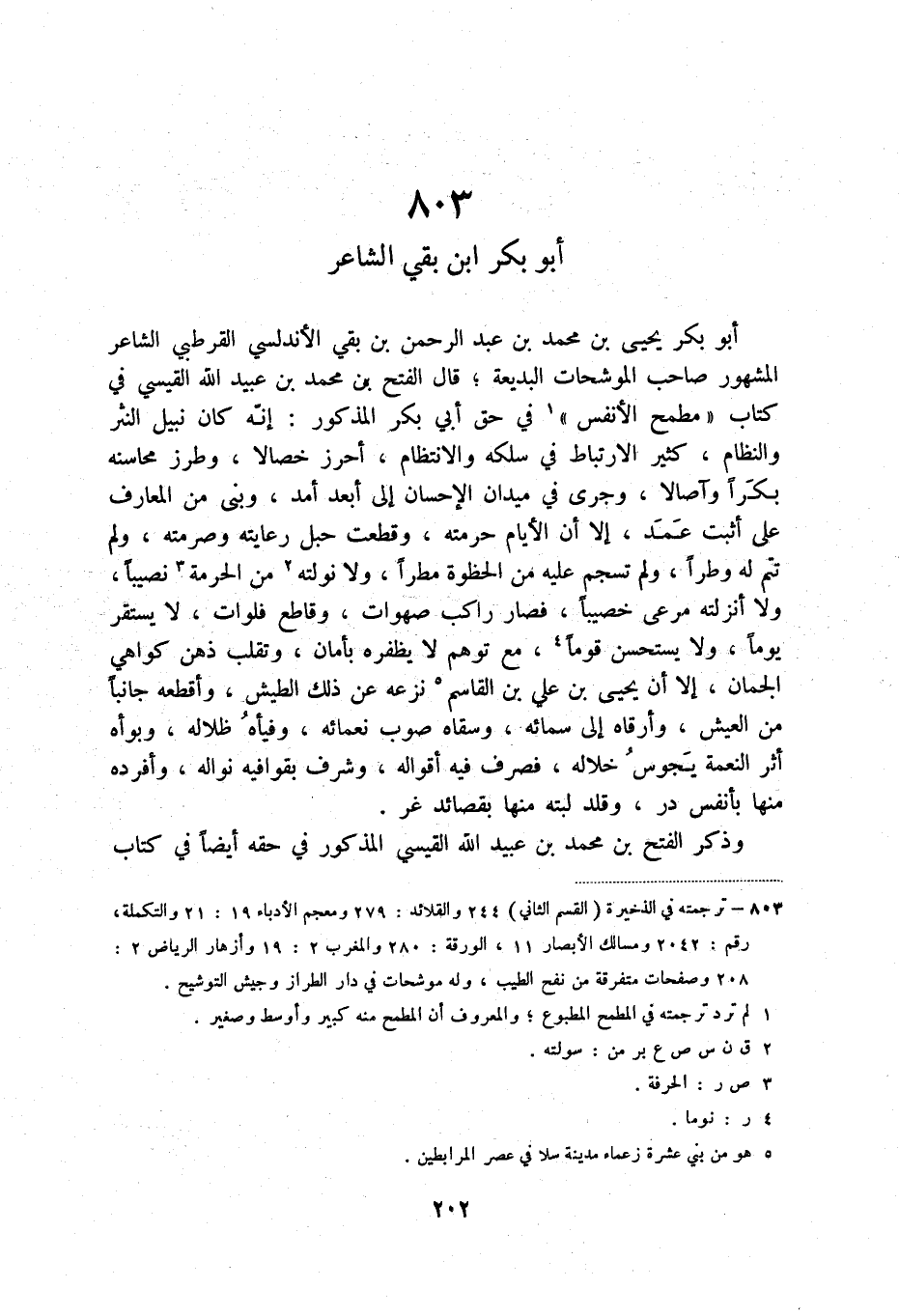 أبو بكر يحيى بن محمد بن عبد الرحمن بن بقي الأندلسي القرطبي الشاعر المشهور صاحب الموشحات البديعة؛ قال الفتح بن محمد بن عبيد الله القيسي في كتاب " مطمح الأنفس " (2) في حق أبي بكر المذكور: أنه كان نبيل النثر والنظام، كثير الارتباط في سلكه والانتظام، وأحرز خصالاً، وطرز محاسنه بكراً وآصالاً، وجرى في ميدان الإحسان إلى أبعد أمد، وبنى من المعارف على أثبت عمد، إلا أن الأيام حرمته، وقطعت حبل رعايته وصرمته، ولم تتم له وطراً، ولم تسجم عليه من الحظوة مطراً، ولا نولته (3) من الحرمة (4) نصيباً، ولا أنزلته مرعى خصيباً، فصار راكب صهوات، وقاطع فلوات، لا يستقر يوماً ولا يستحسن قوماً (5) ، مع توهم لا يظفره بأمان، وتقلب ذهن كواهي الجمان، إلا أن يحيى بن علي بن القاسم (6) نزعه عن ذلك الطيش، وأقطعه جانباً من العيش، وأرقاه إلى سمائه، وسقاه صوب نعمائه، وفيأه ظلاله، وبوأه أثر النعمة يجوس خلاله، فصرف فيه أقواله، وشرف بقوافيه نواله، وأفرده منها بأنفس در، وقلد لبته منها بقصائد غر.