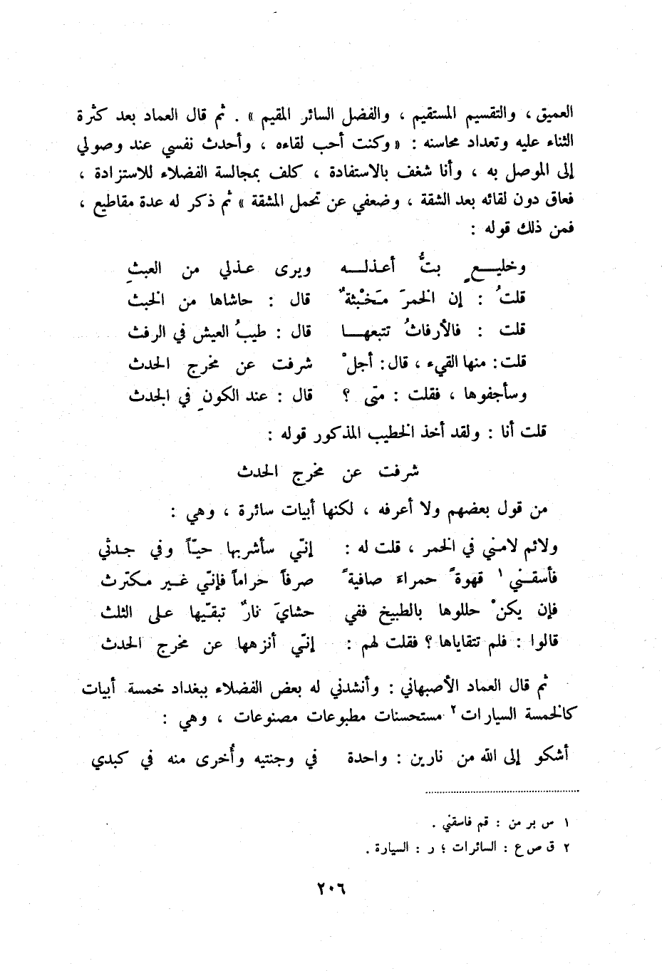 قالوا: فلم تتقاياها فقلت لهم ... إني أنزهها عن مخرج الحدث ثم قال العماد الأصبهاني: وأنشدني له بعض الفضلاء ببغداد خمسة أبيات كالخمسة السيارات (2) مستحسنات مطبوعات مصنوعات، وهي: