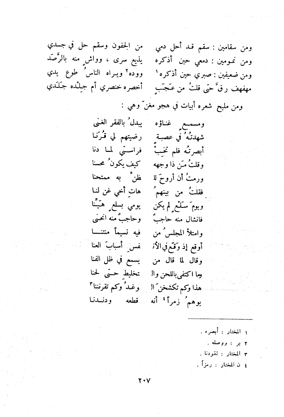مهفهف رق حتى قلت من عجبٍ ... أخصره خنصري أم جلده جلدي ومن مليح شعره أبيات في هجو مغن وهي: