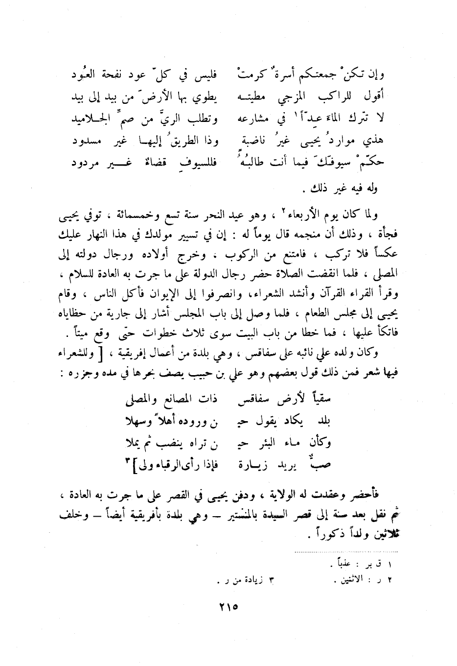 صب يريد زيارة ... فإذا رأى الرقباء ولى] (3) فأحضر وعقدت له الولاية، ودفن يحيى في القصر على ما جرت به العادة، ثم نقل بعد سنة إلى قصر السيدة بالمنستير - وهي بلدة إفريقية أيضاً - وخلف ثلاثين ولداً ذكوراً.
