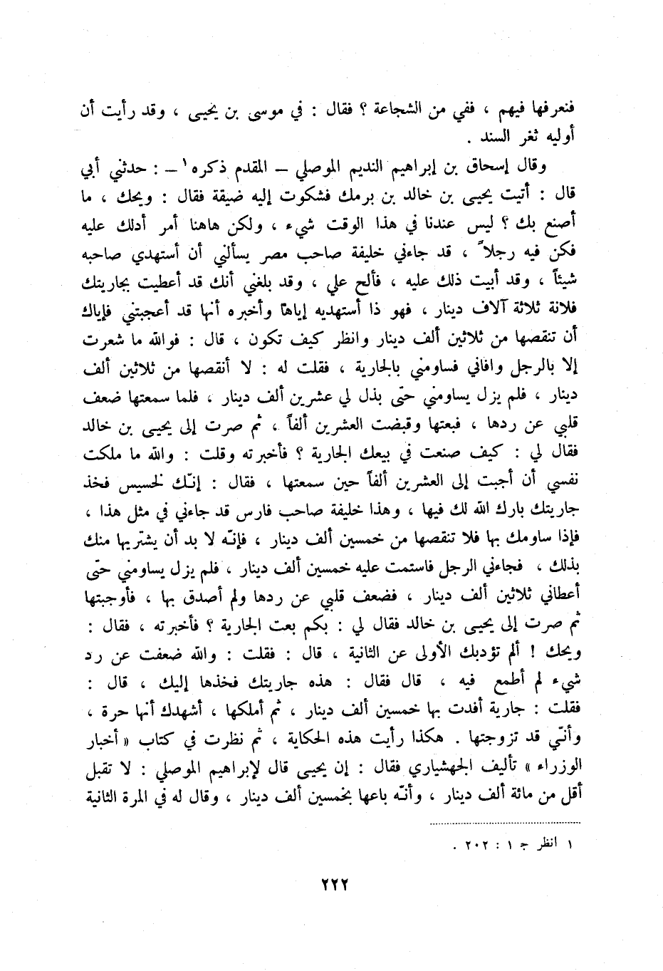 وقال إسحاق بن إبراهيم النديم الموصلي - المقدم ذكره (1) : حدثني أبي قال: أتيت يحيى بن خالد بن برمك فشكوت إليه ضيقة فقال: ويحك، ما أصنع بك ليس عندنا في هذا الوقت شيء، ولكن هاهنا أمر أدلك عليه فكن فيه رجلاً، قد جاءني خليفة صاحب مصر يسألني أن أستهدي صاحبه شيئاً، وقد أبيت ذلك عليه، فألح علي، وقد بلغني أنك قد أعطيت بجاريتك فلانة ثلاثة آلاف دينار، فهو ذا أستهديه إياها وأخبره أنها قد أعجبتني فإياك أن تنقصها من ثلاثين ألف دينار وانظر كيف تكون، قال: فوالله ما شعرت إلا بالرجل وافاني فساومني بالجارية، فقلت له: لا أنقصها من ثلاثين ألف دينار، فلم يزل يساومني حتى بذل لي عشرين ألف دينار، فلما سمعتها ضعف قلبي عن ردها، فبعتها وقبضت العشرين ألفاً، ثم صرت إلى يحيى بن خالد فقال لي: كيف صنعت في بيعك الجارية فأخبرته وقلت: والله ما ملكت نفسي أن أجبت إلى العرين ألفاً حين سمعتها، فقال: إنك لخسيس فخذ جاريتك بارك الله لك فيها، وهذا خليفة صاحب فارس قد جاءني في مثل هذا، فإذا ساومك بها فلا تنقصها من خمسين ألف دينار، فإنه لا بد أن يشتريها منك بذلك، فجاءني الرجل فاستمت عليه خمسين ألف دينار، فلم يزل يساومني حتى أعطاني ثلاثين ألف دينار، فضعف قلبي عن ردها ولم أصدق بها، فأوجبتها ثم صرت إلى يحيى بن خالد فقال لي: بكم بعت الجارية فأخبرته، فقال: ويحك! ألم تؤدبك الأولى عن الثانية، قال: فقلت: والله ضعفت عن رد شيء لم أطمع فيه، قال فقال: هذه جاريتك فخذها إليك، قال: فقلت: جارية أفدت بها خمسين ألف دينار، ثم أملكها، أشهدك أنها حرة، أني قد تزوجتها. هكذا رأيت هذه الحكاية، ثم نظرت في كتاب " أخبار الوزراء " تأليف الجهشياري فقال: إن يحيى قال لإبراهيم الموصلي: لا تقبل أقل من مائة ألف دينار، وأنه باعها بخمسين ألف دينار، وقال له في المرة الثانية