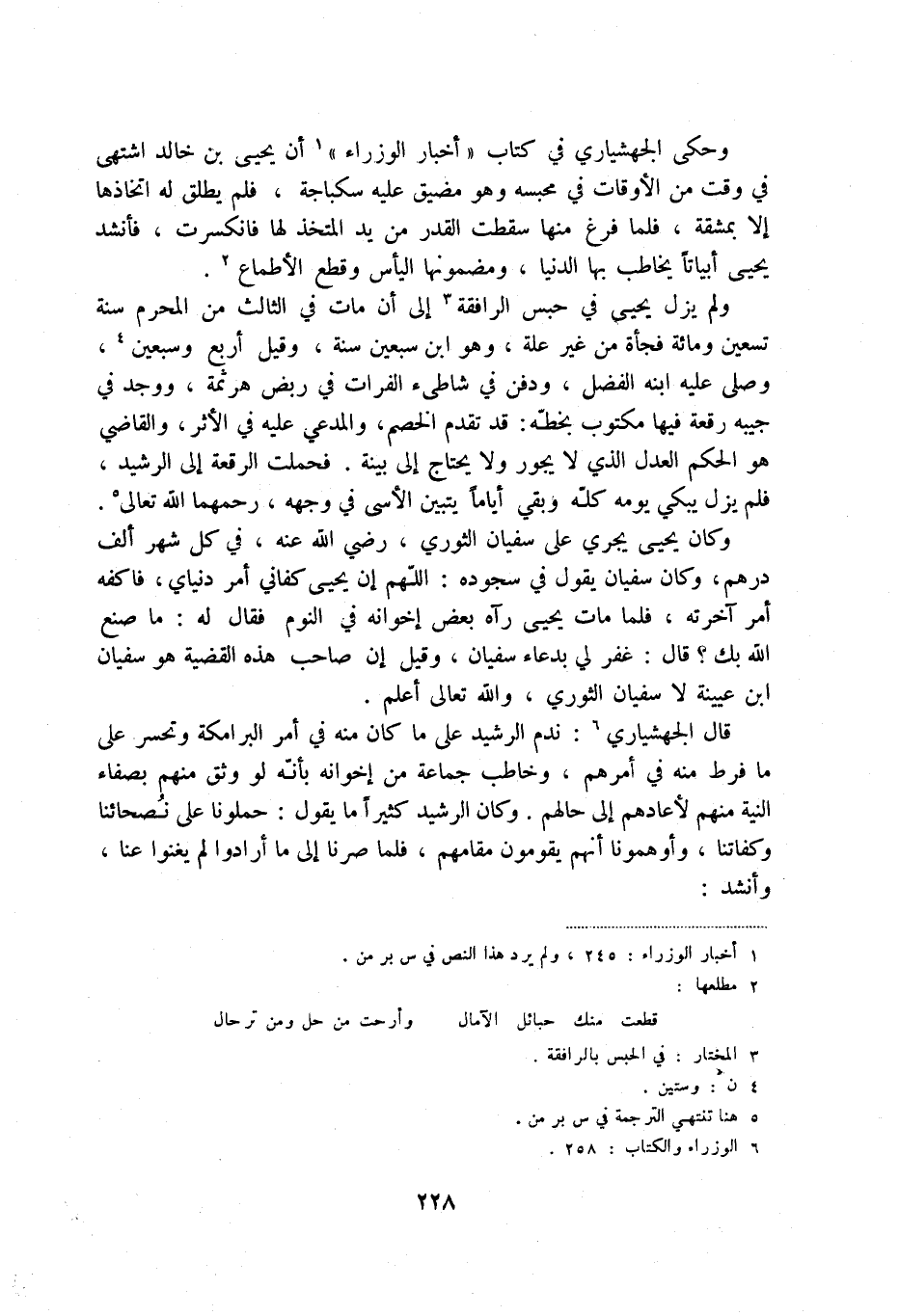 ولم يزل يحيى في حبس الرافقة (3) إلى أن مات في الثالث من المحرم سنة تسعين ومائة فجأة من غير علة، وهو ابن سبعين سنة، وقيل أربع وسبعين (4) ، وصلى عليه ابنه الفضل، ودفن في شاطئ الفرات في ربض هرثمة، ووجد في جيبه رقعة مكتوب فيها بخطه: قد تقدم الخصم، والمدعي عليه في الأثر، والقاضي هو الحكم العدل الذي لا يجور ولا يحتاج إلى بينة. فحملت الرقعة إلى الرشيد، فلم يزل يبكي يومه وبقي أياماً يتبين الأسى في وجهه، رحمهم الله تعالى (5) .