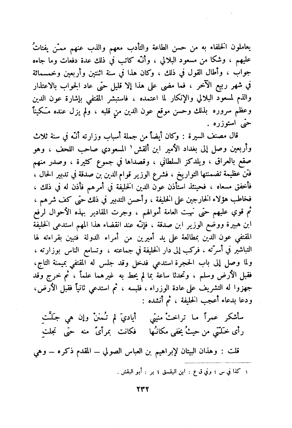 يعاملون الخلفاء به من حسن الطاعة والتأدب معهم والذب عنهم ممن يفتات عليهم، وشكا من مسعود البلالي، وأنه كاتب في ذلك عدة دفعات وما جاءه جواب، وأطال القول في ذلك، وكان هذا في سنة اثنتين وأربعين وخمسمائة في شهر ربيع الآخر، فما مضى على هذا إلا قليل حتى عاد الجواب بالاعتذار والذم لمسعود البلاني والإنكار لما اعتمده، فاستبشر المقتفي بإشارة عون الدين وعظم سروره بذلك وحسن موقع عون الدين من قلبه، ولم يزل عنده مكيناً حتى استوزره.