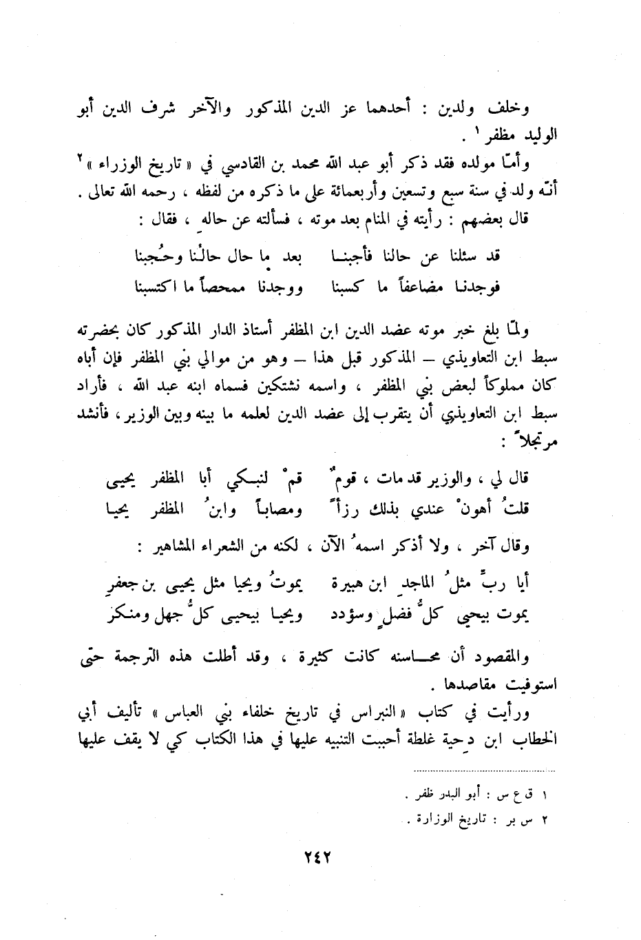 فوجدنا مضاعفاً ما كسبنا ... ووجدنا ممحصاً ما اكتسبنا ولما بلغ خبر موته عضد الدين ابن المظفر أستاذ الدار المذكور كان بحضرته سبط ابن التعاويذي - المذكور قبل هذا - وهو من موالي بني المظفر فإن أباه كان مملوكاً لبعض بني المظفر، واسمه نشتكين فسماه ابنه عبد الله، فأراد سبط بن التعاويذي أن يتقرب إلى عضد الدولة لعلمه ما بينه وبين الوزير، فأنشد مرتجلاً: