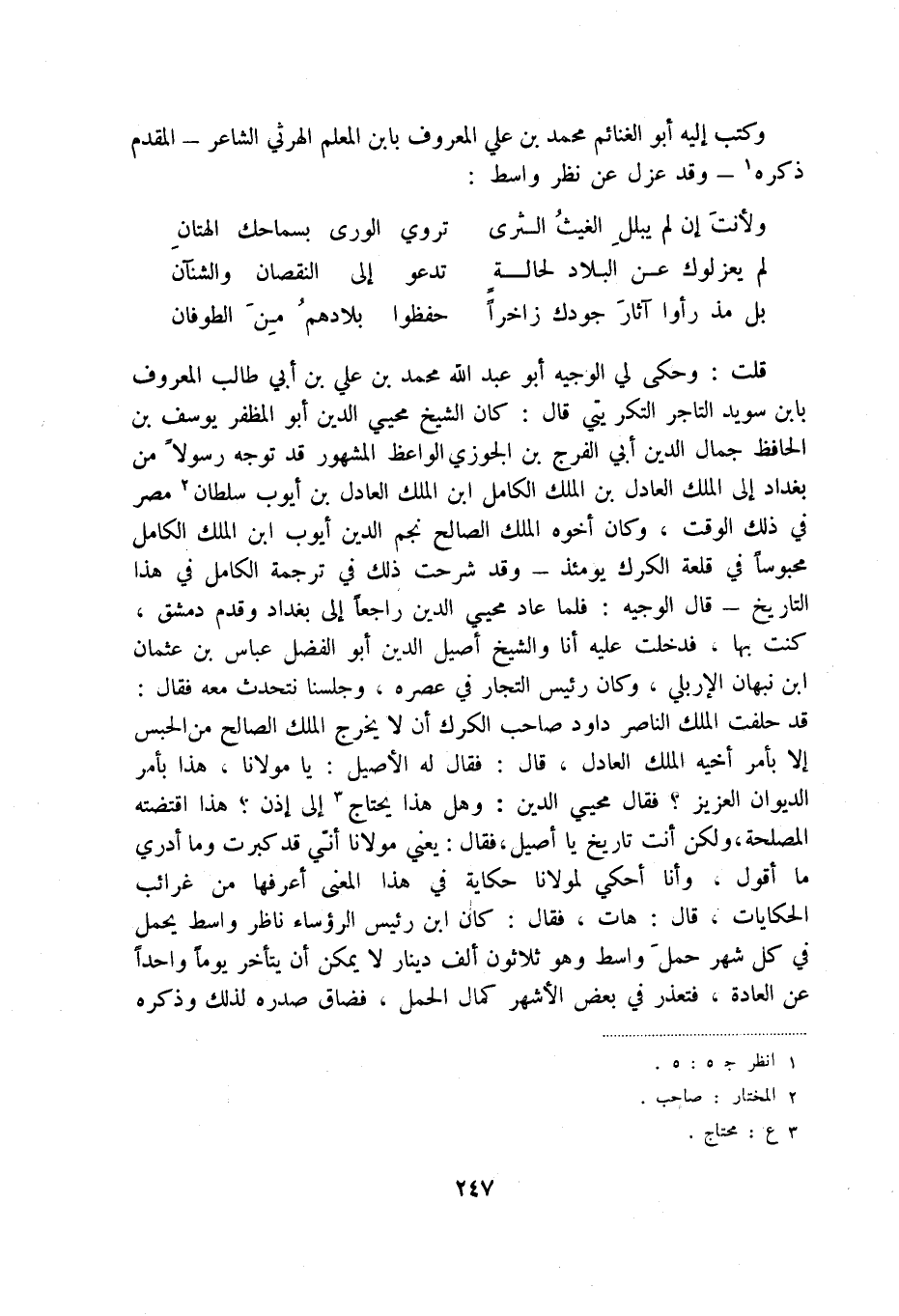 بل مذ رأوا آثار جودك زاخراً ... حفظوا بلادهم من الطوفان قلت: وحكى لي الوجيه أبو عبد الله محمد بن علي بن أبي طالب المعروف بابن سويد التاجر التكريتي قال: كان الشيخ محيي الدين أبو المظفر يوسف بن الحافظ جمال الدين أبي الفرج بن الجوزي الواعظ المشهور قد توجه رسولاً من بغداد إلى الملك العادل ابن الملك الكامل ابن الملك العادل بن أيوب سلطان (2) مصر في ذلك الوقت، وكان أخوه الملك الصالح نجم الدين أيوب ابن الملك الكامل محبوساً في قلعة الكرك يومئذ - وقد شرحت ذلك في ترجمة الكامل في هذا التاريخ - قال الوجيه: فلما عاد محيي الدين راجعاً إلى بغداد وقدم دمشق، كنت بها، فدخلت عليه أنا والشيخ أصيل الدين أبو الفضل عباس بن عثمان بن نبهان الإربلي، وكان رئيس التجار في عصره، وجلسنا نتحدث معه فقال: قد حلفت الملك الناصر داود صاحب الكرك أن لا يخرج الملك الصالح من الحبس إلا بأمر أخيه الملك العادل، قال: فقال له الأصيل: مولانا، هذا بأمر الديوان العزيز فقال محيي الدين: وهل هذا يحتاج (3) إلى إذن هذا اقتضته المصلحة، ولكن أنت تاريخ يا أصيل، فقال: يعني مولانا أني قد كبرت وما أدري ما أقول، وأنا أحكي لمولانا حكاية في هذا المعنى أعرفها من غرائب الحكايات، قال: هات، فقال: كان ابن رئيس الرؤساء ناظر واسط يحمل في كل شهر حمل واسط وهو ثلاثون ألف دينار لا يمكن أن يتأخر يوماً واحداً عن العادة، فتعذر في بعض الأشهر كمال الحمل، فضاق صدره لذلك وذكره