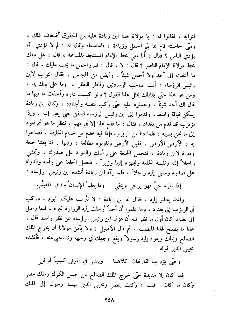 لنوابه، فقالوا له: يا مولانا هذا ابن زبادة عليه من الحقوق أضعاف ذلك، ومتى حاسبته قام بما يتم الحمل وزيادة، فاستدعاه وقال له: لم لا تؤدي كما يؤدي الناس فقال: أنا معي خط الإمام المستنجد بالمسامحة، قال: هل معك خط مولانا الإمام الناصر قال: لا، قال: قم واحمل ما يجب عليك، قال: ما ألتفت إلى أحد ولا أحمل شيئاً. ونهض من المجلس، فقال النواب لابن رئيس الرؤساء: أنت صاحب الوسادتين وناظر النظار، وما على يدك يد، ومن هو هذا حتى يقابلك بمثل هذا القول ولو كبست داره وأخذت ما فيها ما قال لك أحد شيئاً، وحملوه عليه حتى ركب بنفسه وأجناده، وكان ابن زبادة يسكن قبالة واسط، وقدموا إلى ابن رؤساء السفن حتى يعبر إليه، وإذا بزبزب قد قدم من بغداد، فقال: ما قدم هذا إلا في مهم، ننظر ما هو ثم نعود إلى ما نحن بسببه، فلما دنا من الزبزب فإذا فيه خدم من خدام الخليفة، فصاحوا به: الأرض الأرض، فقبل الأرض وناولوه مطالعة، وفيها: قد بعثنا خلعة ودواة لابن زبادة، فتحمل الخلعة على رأسك والدواة على صدرك، وتمشي راجلاً إليه وتلبسه الخلعة وتجهزه إلينا وزيراً، فحمل الخلعة على رأسه والدواة على صدره ومشى إليه راجلاً، فلما رآه ابن زبادة أنشده ابن رئيس الرؤساء:
