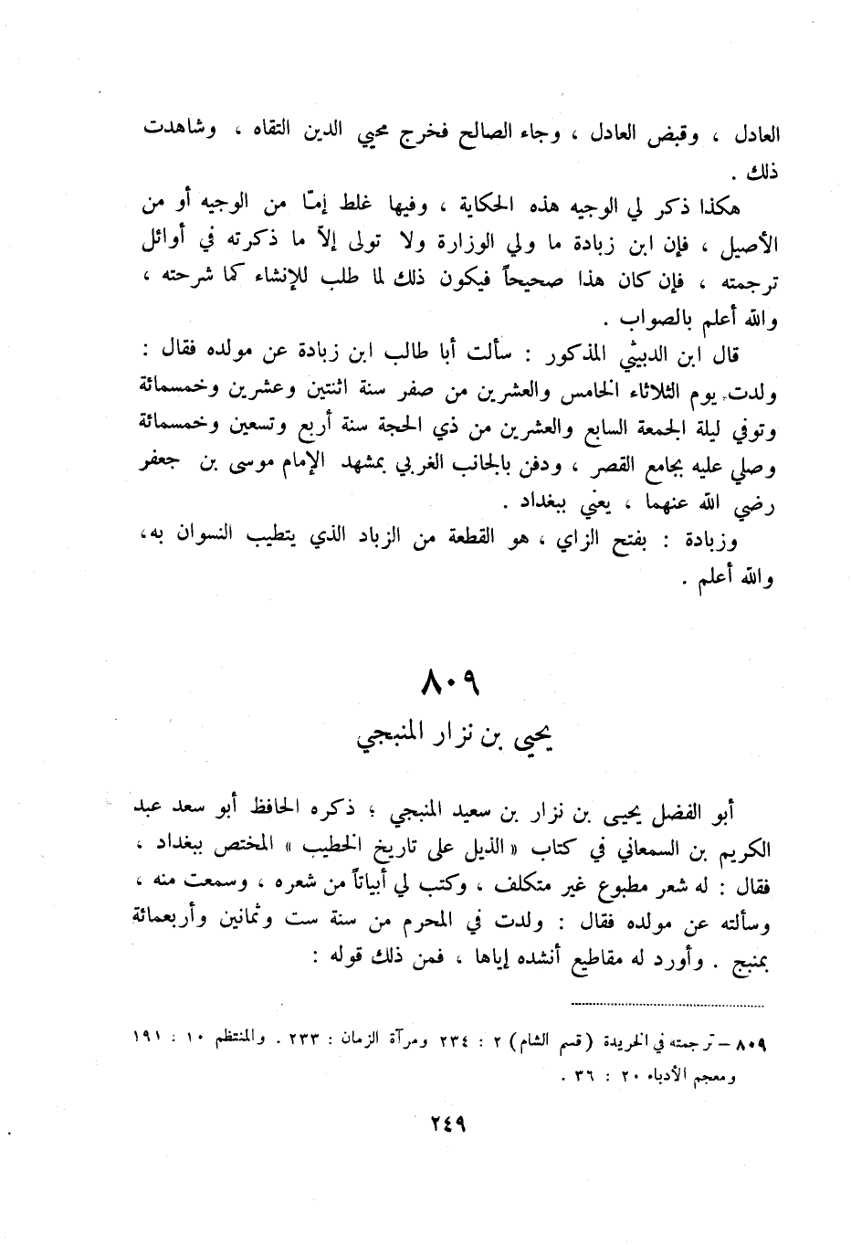 أبو الفضل يحيى بن نزار بن سعيد المنبجي، ذكره الحافظ أبو سعد عبد الكريم السمعاني في كتاب " الذيل على تاريخ الخطيب " المختص ببغداد، فقال: له شعر مطبوع غير متكلف، وكتب لي أبياتاً من شعره، وسمعت منه، وسألته عن مولده فقال: ولدت في المحرم من سنة ست وثمانين وأربعمائة بمنبج. وأورد له مقاطيع أنشده إياها، فمكن ذلك قوله: