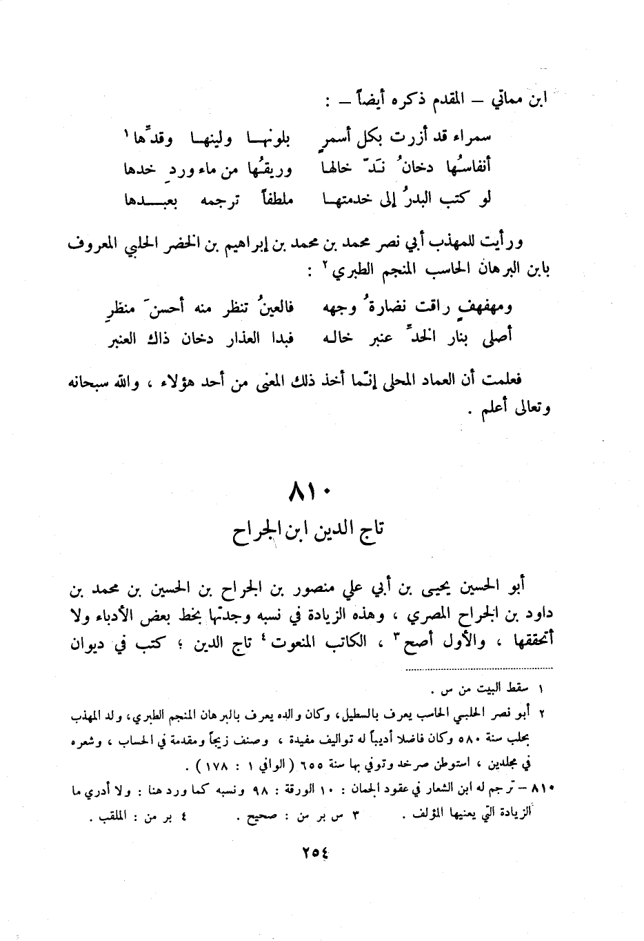 لو كتب البدر إلى خدمتها ... ملطفاً ترجمه بعبدها ورأيت للمهذب أبي نصر محمد بن إبراهيم بن الخضر الحلبي المعروف بابن البرهان الحاسب المنجم الطبري (2) :