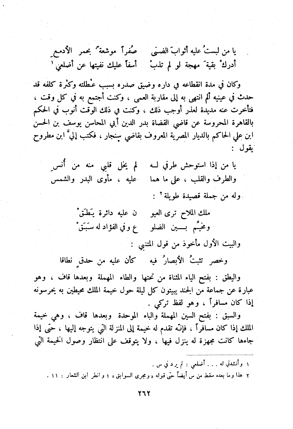 أدرك بقية مهجة لو لم تذب ... أسفاً عليك نفيتها عن أضلعي (1) وكان في مدة انقطاعه في داره وضيق صدره بسبب عطلته وكثرة كلفه قد حدث في عينيه ألم انتهى به إلى مقاربة العمى، وكنت أجتمع به في كل وقت، فتأخرت عنه مديدة لعذر أوجب ذلك، وكنت في ذلك الوقت أنوب في الحكم بالقاهرة المحروسة عن قاضي القضاة بدر الدين أبي المحاسن يوسف بن الحسن بن علي الحاكم بالديار المصرية المعروف بقاضي سنجار، فكتب إلي ابن مطروح يقول:
