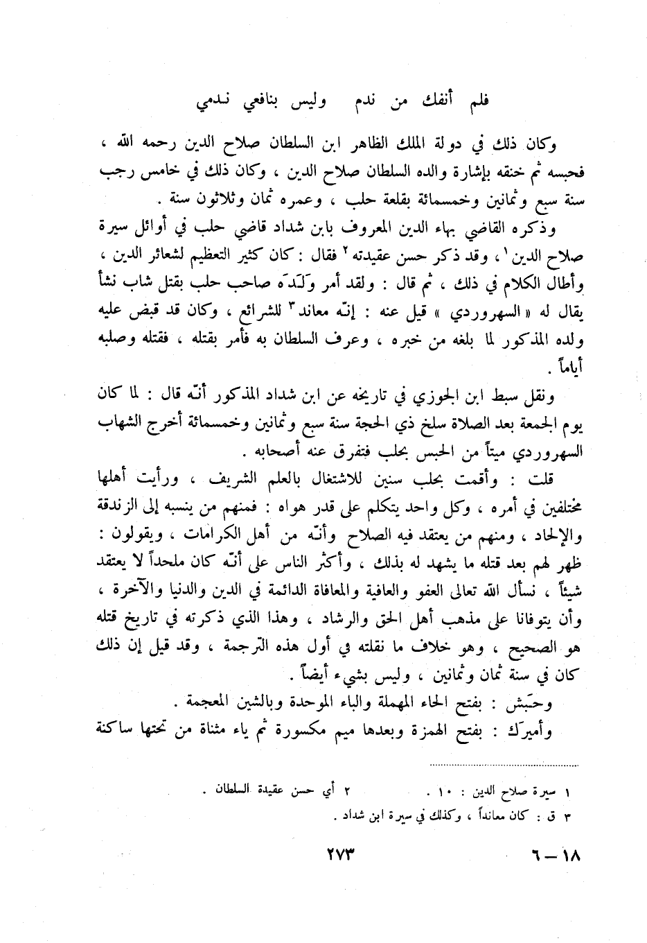 وذكره القاضي بهاء الدين المعروف بابن شداد قاضي حلب في أوائل سيرة صلاح الدين (1) ، وقد ذكر حسن عقيدته (2) فقال: كان كثير التعظيم لشعائر الدين، وأطال الكلام في ذلك، ثم قال: ولقد أمر ولده صاحب حلب بقتل شاب نشأ يقال له " السهروردي " قيل عنه: إنه معاند (3) للشرائع، وكان قد قبض عليه ولده المذكور لما بلغه خبره، وعرف السلطان به فأمر بقتله، فقتله وصلبه أياماً.