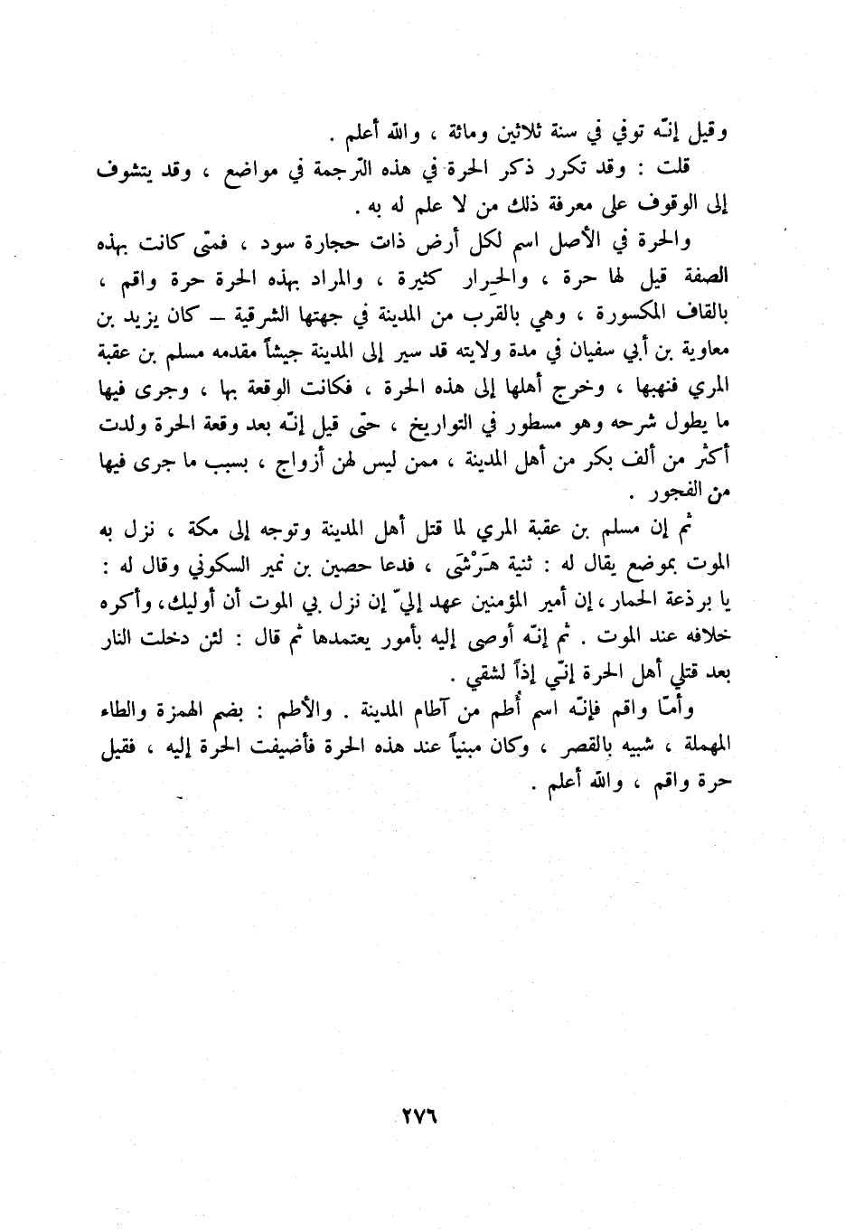 والحرة في الأصل اسم لكل أرض ذات حجارة سود، فمتى كانت بهذه الصفة قيل لها حرة، والحرار كثيرة، والمراد بهذه الحرة حرة واقم، بالقاف المكسورة، وهي بالقرب من المدينة في جهتها - كان يزيد بن معاوية بن أبي سفيان في مدة ولايته قد سير إلى المدينة جيشاً مقدمه مسلم بن عقبة المري فنهبها، وخرج أهلها إلى هذه الحرة، فكانت الواقعة بها، وجرى فيها ما يطول شرحه وهو مسطور في التواريخ، حتى قيل إنه بعد وقعة الحرة ولدت أكثر من ألف بكر من أهل المدينة، ممن ليس لهن أزواج، بسبب ما جرى فيها من الفجور.
