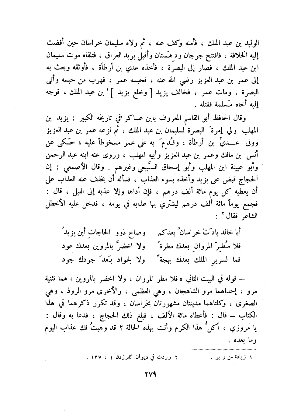 فما لسرير الملك بعدك بهجة ... ولا لجواد بعد جودك جود - قوله في البيت الثاني " فلا مطر لمروان، ولا اخضر بالمروين " هما تثنية مرو، إحداهما مرو الشاهجان، وهي العظمى، والأخرى مرو الروذ، وهي الصغرى، وكلتاهما مدينتان مشهورتان بخراسان، وقد تكرر ذكرهما في هذا الكتاب - قال: فأعطاه مائة الألف، فبلغ ذلك الحجاج، فدعا به وقال: يا مروزي، أكل هذا الكرم وأنت بهذه الحالة قد وهبت لك عذاب اليوم وما بعده.