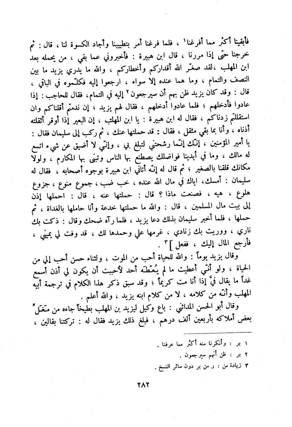 فأبقينا أكثر مما أفرغنا (1) ، فلما فرغنا أمر بتطييبنا وأجاد الكسوة لنا، وقال: ثم خرجنا حتى إذا مررنا، قال ابن هبيرة، فأخبروني عما بقي، من يحمله بعد ابن المهلب، لقد صغر الله قدركم وأخطاركم، والله ما يدري يزيد ما بين النصف والتمام، وما هما عنده سواء، ارجعوا إليه فكلموه في الباقي، قال: وقد كان يزيد ظن بهم أن سيرجعون (2) إليه في التمام، فقال للحاجب: إذا عادوا أدخلهم، فقال لهم يزيد، إن ندمتم أقلناكم وإن استقللتم زدناكم، فقال له ابن هبيرة: يا ابن المهلب، إن البعير إذا أوقر أثقلته أذناه، وأنا بما بقي مثقل، فقال: قد حملتها عنك، ثم ركب إلى سليمان فقال: يا أمير المؤمنين، إنك إنما رشحتني لتبلغ بي، وإني لا أضيق عن شيء اتسع له مالك، وما في أيدينا فواضلك يصطنع بها الناس وتبنى بها المكارم، ولولا مكانك قلقنا بالصغير، ثم قال له إنه أتاني ابن هبيرة بوجوه أصحابه، فقال له سليمان: أمسك اياك في مال الله عنده، خب ضب، جموع منوع، جزوع هلوع، هيه، فصنعت ماذا قال: حملتها عنه، قال: احملها إذن إلى بيت مال المسلمين، قال: والله ما حملتها خدعة وأنا حاملها بالغداة، ثم حملها، فلما خبر سليمان بذلك دعا يزيد فلما رآه ضحك وقال: ذكت بك ناري، ووريت بك زنادي، غرمها علي وحمدها لك، قد وفت لي يميني، فأرجع المال إليك، ففعل] (3) .
