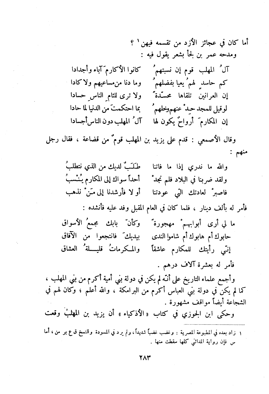 وأجمع علماء التاريخ على أنه لم يكن في دولة بني أمية أكرم من بني المهلب، كما لم يكن في دولة بني العباس أكرم من البرامكة، والله أعلم، وكان لهم في الشجاعة أيضاً مواقف مشهورة.