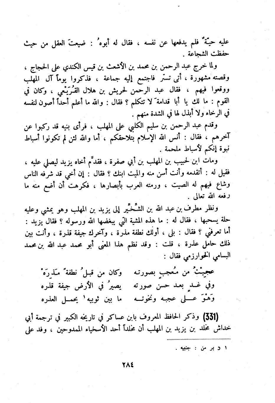 وهو على عجبه ونخوته ... ما بين ثوبيه (1) يحمل العذره (331) وذكر الحافظ المعروف بابن عساكر في تاريخه الكبير في ترجمة أبي خداش مخلد بن يزيد بن المهلب أن مخلداً أحد الأسخياء الممدوحين، وفد على