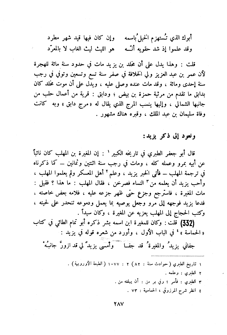 (332) قلت: وكان للمغيرة ابن اسمه بشر ذكره أبو تمام الطائي في كتاب " الحماسة " (4) في الباب الأول، وأورد من شعره قوله في يزيد: