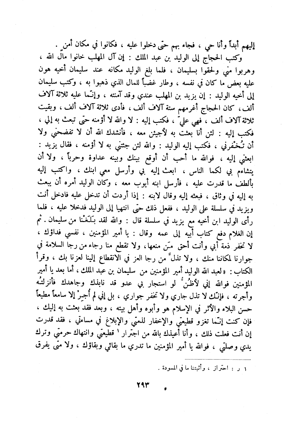 وكتب الحجاج إلى الوليد بن عبد الملك: إن آل المهلب خانوا مال الله، وهربوا مني ولحقوا بسليمان، فلما بلغ الوليد مكانه عند سليمان أخيه هون عليه بعض ما كان في نفسه، وطار غضباً للمال الذي ذهبوا به، وكتب سليمان إلى أخيه الوليد: إن يزيد بن المهلب عندي وقد آمنته، وإنما عليه ثلاثة آلاف ألف، كان الحجاج أغرمهم ستة آلاف ألف، فأدى ثلاثة آلاف ألف، وبقيت ثلاثة آلاف ألف، فهن علي، فكتب إليه: لا والله لا أؤمنه حتى تبعث به إلي، فكتب إليه: لئن أنا بعثت به لأجيئن معه، فانشدك الله أن لا تفضحني ولا أن تخفرني، فكتب إليه الوليد: والله لئن جئتني به لا أؤمنه، فقال يزيد: ابعثني إليه، فوالله ما أحب أن أوقع بينك وبينه عداوةً وحرباً، ولا أن يتشاءم بي لكما الناس، ابعث إليه بي وأرسل معي ابنك، واكتب إليه بألطف ما قدرت عليه، فأرسل ابنه أيوب معه، وكان الوليد أمره أن يبعث به إليه في وثاق، فبعثه إليه وقال لابنه: إذا أردت أن تدخل عليه فادخل أنت ويزيد في سلسلة على الوليد، ففعل ذلك حتى انتهيا إلى الوليد فدخلا عليه، فلما رأى الوليد ابن أخيه مع يزيد في سلسلة قال: والله لقد بلغنا من سليمان. ثم إن الغلام دفع كتاب أبيه إلى عمه وقال: يا أمير المؤمنين، نفسي فداؤك، لا تخفر ذمة أبي وأنت أحق من منعها، ولا تقطع منا رجاء من رجا السلامة في جوارنا لمكاننا منك، ولا تذل من رجا العز في الانقطاع إلينا لعزنا بك، وقرأ الكتاب: " لعبد الله الوليد أمير المؤمنين من سليمان بن عبد الملك، أما بعد يا أمير المؤمنين فوالله إني لأظن لو استجار بي عدو قد نابذك وجاهدك فأنزلته وأجرته، فإنك لا تذل جاري ولا تخفر جواري، بل إني لم أجر إلا سامعاً مطيعاً حسن البلاء والأثر في الإسلام هو وأبوه وأهل بيته، وبعد فقد بعثت به إليك، فإن كنت إنما تعزو قطيعتي والإخفار لذمتي والإبلاغ في مساءتي، فقد قدرت إن أنت فعلت ذلك، وأنا أعيذك بالله من اجترار (1) قطيعتي وانتهاك حرمتي وترك يدي وصلتي، فوالله يا أمير المؤمنين ما تدري مل بقائي وبقاؤك، ولا متى يفرق