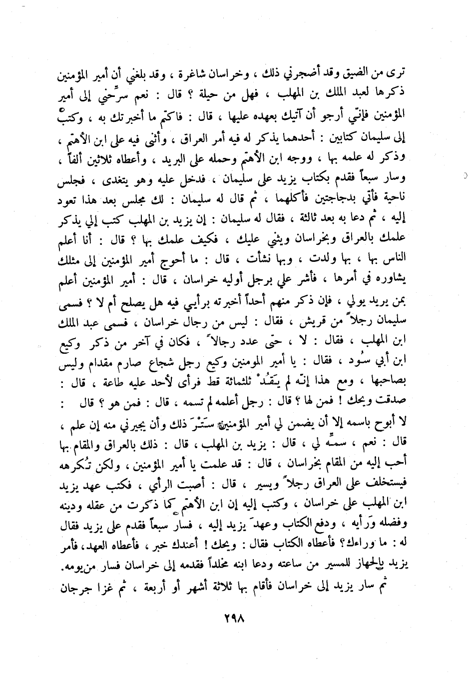 ترى من الضيق وقد أضجرني ذلك، وخراسان شاغرة، وقد بلغني أن أمير المؤمنين ذكرها لعبد الملك بن المهلب، فهل من حيلة قال: نعم سرحني إلى أمير المؤمنين فإني أرجو أن آتيك بعهده عليها، قال: فاكتم ما أخبرتك به، وكتب إلى سليمان كتابين: أحدهما يذكر له فيه أمر العراق، وأثنى فيه على ابن الأهتم، وذكر له علمه بها، ووجه ابن الأهتم وحمله على البريد، وأعطاه ثلاثين ألفاً وسار سبعاً فقدم بكتاب يزيد على سليمان، فدخل عليه وهو يتغدى، فجلس ناحية فأتي له بدجاجتين فاكلهما، ثم قال له سليمان: لك مجلس بعد هذا تعود إليه، ثم دعا به بعد ثالثة، فقال له سليمان: إن يزيد بن المهلب كتب إلي يذكر علمك بالعراق وبخراسان ويثني عليك، فكيف علمك بها قال: أنا أعلم الناس بها، بها ولدت، وبها نشأت، قال: ما أحوج أمير المؤمنين إلى مثلك يشاوره في أمرها، فأشر علي برجل أوليه خراسان، قال: أمير المؤمنين أعلم بمن يريد يولي، فإن ذكر منهم أحداً أخبرته برأيي فيه هل يصلح أم لا فسمى سليمان رجلاً من قريش، فقال: ليس من رجال خراسان، فسمى عبد الملك بن المهلب، فقال: لا، حتى عدد رجالاً، فكان آخر من ذكر وكيع بن أبي سود، فقال: يا أمير المؤمنين وكيع رجل شجاع صارم مقدان وليس بصاحبها، ومع هذا إنه لم يقد ثلثمائة قط فرأى لأحد عليه طاعة، قال: صدقت ويحك! فمن لها قال: رجل أعلمه لم تسمه، قال: فمن هو قال: لا أبوح باسمه إلا أن يضمن لي أمير المؤمنين ستر ذلك وأن يجيرني منه إن علم، قال: نعم، سمه لي، قال: يزيد بن المهلب، قال: ذلك بالعراق والمقام بها أحب إليه من المقام بخراسان، قال: قد علمت يا أمير المؤمنين، ولكن تكرهه فيستخلف على العراق رجلاً ويسير، قال: أصبت الرأي، فكتب عهد يزيد بن المهلب على خراسان، وكتب إليه إن ابن الأهتم كما ذكرت من عقله ودينه وفضله ورايه، ودفع الكتاب وعهد يزيد إليه، فسار سبعاً فقدم على يزيد فقال له: ما وراءك فأعطاه الكتاب فقال: ويحك! خبر، فأعطاه العهد، فأمر يزيد بالجهاز للمسير من ساعته ودعا ابنه مخلداً فقدمه إلى خراسان فسار من يومه.