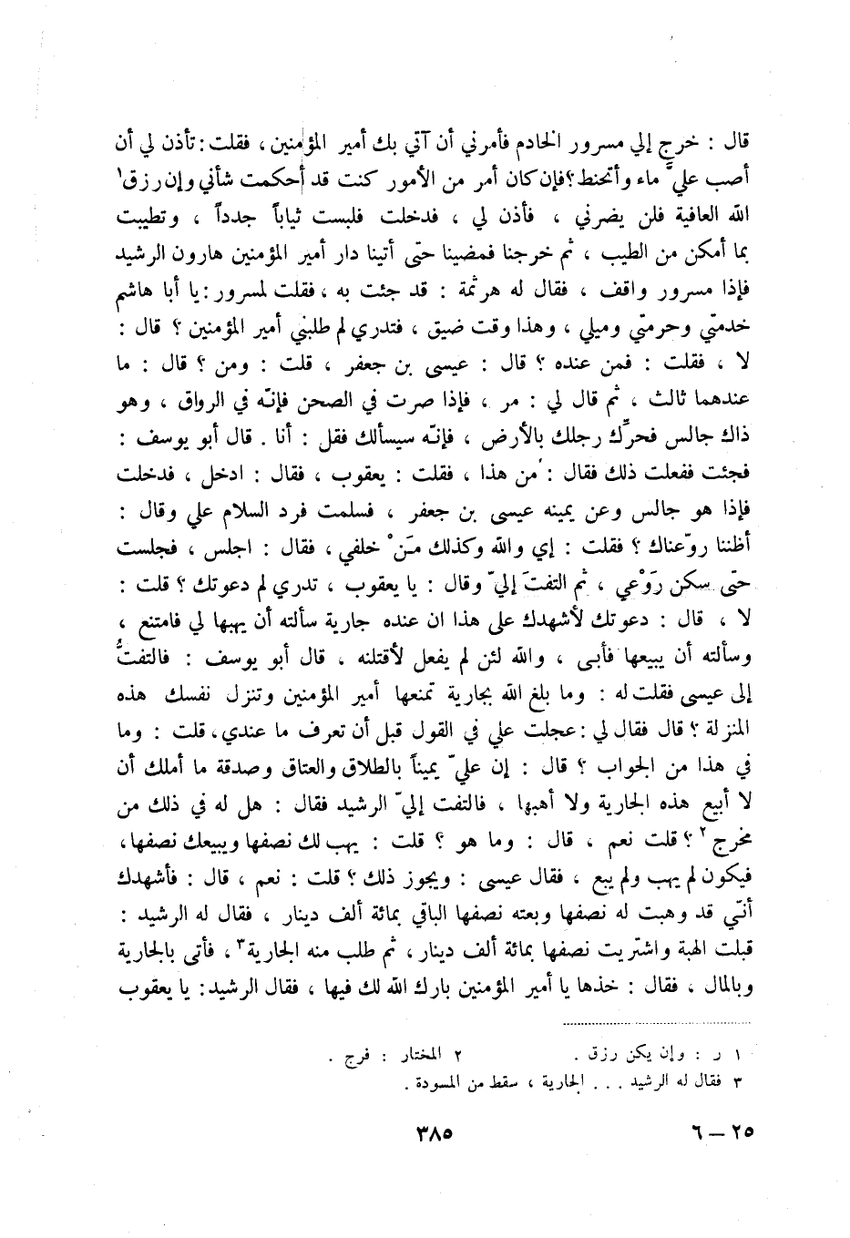 قال: خرج إلي مسرور فامرني أن آتي بك أمير المؤمنين، فقلت: تأذن لي أن أصب علي ماء وأتحنط فإن كان أمر من الأمور كنت قد أحكمت شأني وإن رزق (1) الله العافية فلن يضرني، فأذن لي، فدخلت فلبست ثياباً جدداً، وتطيبت بما أمكن من الطيب، ثم خرجنا فمضينا حتى أتينا دار أمير المؤمنين هارون الرشيد فإذا مسرور واقف، فقال له هرثمة: قد جئت به، فقلت لمسرور: يا أبا هاشم خدمتي وحرمتي وميلي، وهذا وقت ضيق، فتدري لم طلبني أمير المؤمنين قال: لا، فقلت: فمن عنده قال: عيسى بن جعفر، قلت: ومن قال: ما عندهما ثالث، ثم قال لي: مر، فإذا صرت في الصحن فإنه في الرواق، وهو ذاك جالس فحرك رجلك بالأرض، فإنه سيسألك فقل: أنا. قال أبو يوسف: فجئت ففعلت ذلك فقال: من هذا، فقلت: يعقوب، فقال: ادخل، فدخلت فإذا هو جال وعن يمينه عيسى بن جعفر، فسلمت فرد السلام علي وقال: أظننا روعناك فقلت: إي والله وكذلك من خلفي، فقال: اجلس، فجلست حتى سكن روعي، ثم التفت إلي وقال: يا يعقوب، تدري لم دعوتك قلت: لا، قال: دعوتك لأشهدك على هذا إن عنده جارية سألته أن يهبها لي فامتنع، وسألته أن يبيعها فأبى، والله لئن لم يفعل لأقتلنه، قال أبو يوسف: فالتفت إلى عيسى فقلت له: وما بلغ الله بجارية تمنعها أمير المؤمنين وتنزل نفسك هذه المنزلة قال فقال لي: عجلت علي في القول قبل أن تعرف ما عندي، قلت: وما في هذا من الجواب قال: إن علي يميناً بالطلاق والعتاق وصدقة ما أملك أن لا أبيع في هذه الجارية ولا أهبها، فالتفت إلي الرشيد فقال: هل له في ذلك من مخرج (2) قلت: نعم، قال: وما هو قلت: يهب لك نصفها ويبيعك نصفها، فيكون لم يهب ولم يبع، فقال عيسى: ويجوز ذلك قلت: نعم، قال: فأشهدك أني قد وهبت له نصفها وبعته نصفها الباقي بمائة ألف دينار، فقال له الرشيد: قبلت الهبة واشتريت نصفها بمائة ألف دينار، ثم طلب منه الجارية (3) ، فأتى بالجارية وبالمال، فقال: خذها يا أمير المؤمنين بارك الله لك فيها، فقال الرشيد: يا يعقوب